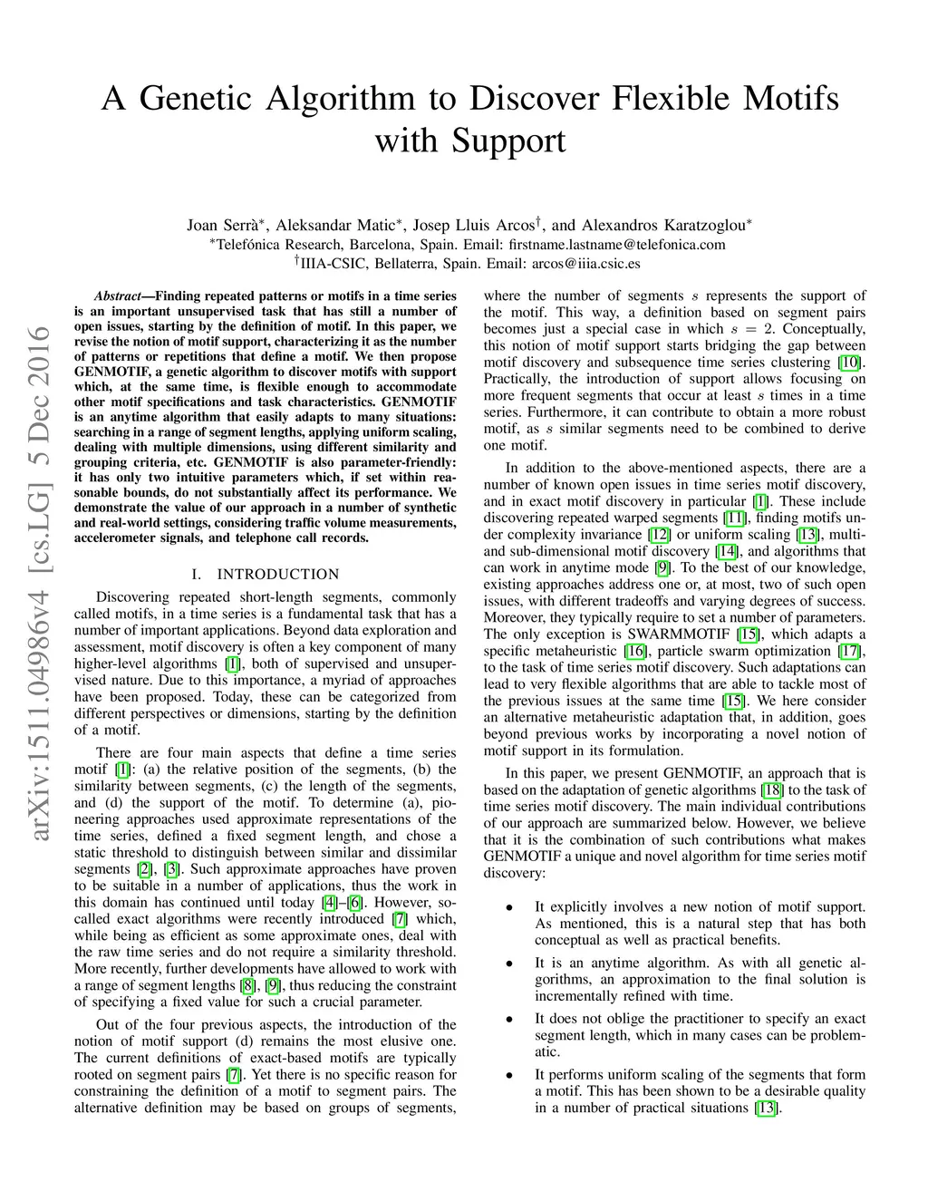 Finding repeated patterns or motifs in a time series is an important unsupervised task that has still a number of open issues, starting by the definition of motif. In this paper, we revise the notion of motif support, characterizing it as the number of patterns or repetitions that define a motif. We then propose GENMOTIF, a genetic algorithm to discover motifs with support which, at the same time, is flexible enough to accommodate other motif specifications and task characteristics. GENMOTIF is an anytime algorithm that easily adapts to many situations: searching in a range of segment lengths, applying uniform scaling, dealing with multiple dimensions, using different similarity and grouping criteria, etc. GENMOTIF is also parameter-friendly: it has only two intuitive parameters which, if set within reasonable bounds, do not substantially affect its performance. We demonstrate the value of our approach in a number of synthetic and real-world settings, considering traffic volume measurements, accelerometer signals, and telephone call records.