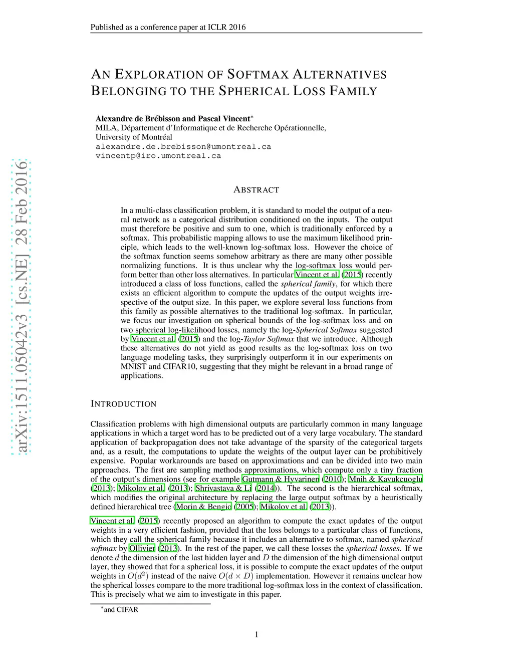 In a multi-class classification problem, it is standard to model the output of a neural network as a categorical distribution conditioned on the inputs. The output must therefore be positive and sum to one, which is traditionally enforced by a softmax. This probabilistic mapping allows to use the maximum likelihood principle, which leads to the well-known log-softmax loss. However the choice of the softmax function seems somehow arbitrary as there are many other possible normalizing functions. It is thus unclear why the log-softmax loss would perform better than other loss alternatives. In particular Vincent et al. (2015) recently introduced a class of loss functions, called the spherical family, for which there exists an efficient algorithm to compute the updates of the output weights irrespective of the output size. In this paper, we explore several loss functions from this family as possible alternatives to the traditional log-softmax. In particular, we focus our investigation on spherical bounds of the log-softmax loss and on two spherical log-likelihood losses, namely the log-Spherical Softmax suggested by Vincent et al. (2015) and the log-Taylor Softmax that we introduce. Although these alternatives do not yield as good results as the log-softmax loss on two language modeling tasks, they surprisingly outperform it in our experiments on MNIST and CIFAR-10, suggesting that they might be relevant in a broad range of applications.