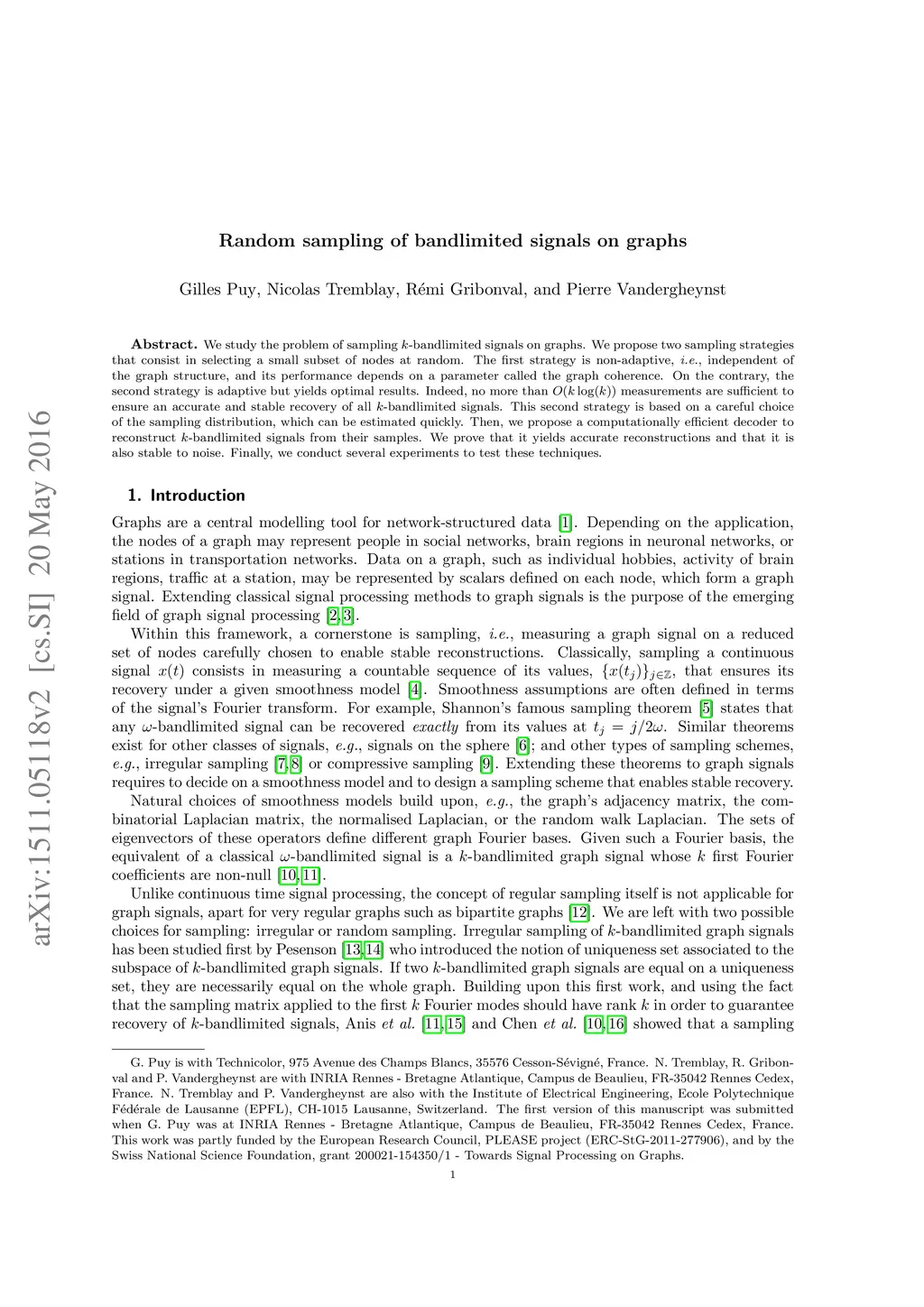 We study the problem of sampling k-bandlimited signals on graphs. We propose two sampling strategies that consist in selecting a small subset of nodes at random. The first strategy is non-adaptive, i.e., independent of the graph structure, and its performance depends on a parameter called the graph coherence. On the contrary, the second strategy is adaptive but yields optimal results. Indeed, no more than O(k log(k)) measurements are sufficient to ensure an accurate and stable recovery of all k-bandlimited signals. This second strategy is based on a careful choice of the sampling distribution, which can be estimated quickly. Then, we propose a computationally efficient decoder to reconstruct k-bandlimited signals from their samples. We prove that it yields accurate reconstructions and that it is also stable to noise. Finally, we conduct several experiments to test these techniques.