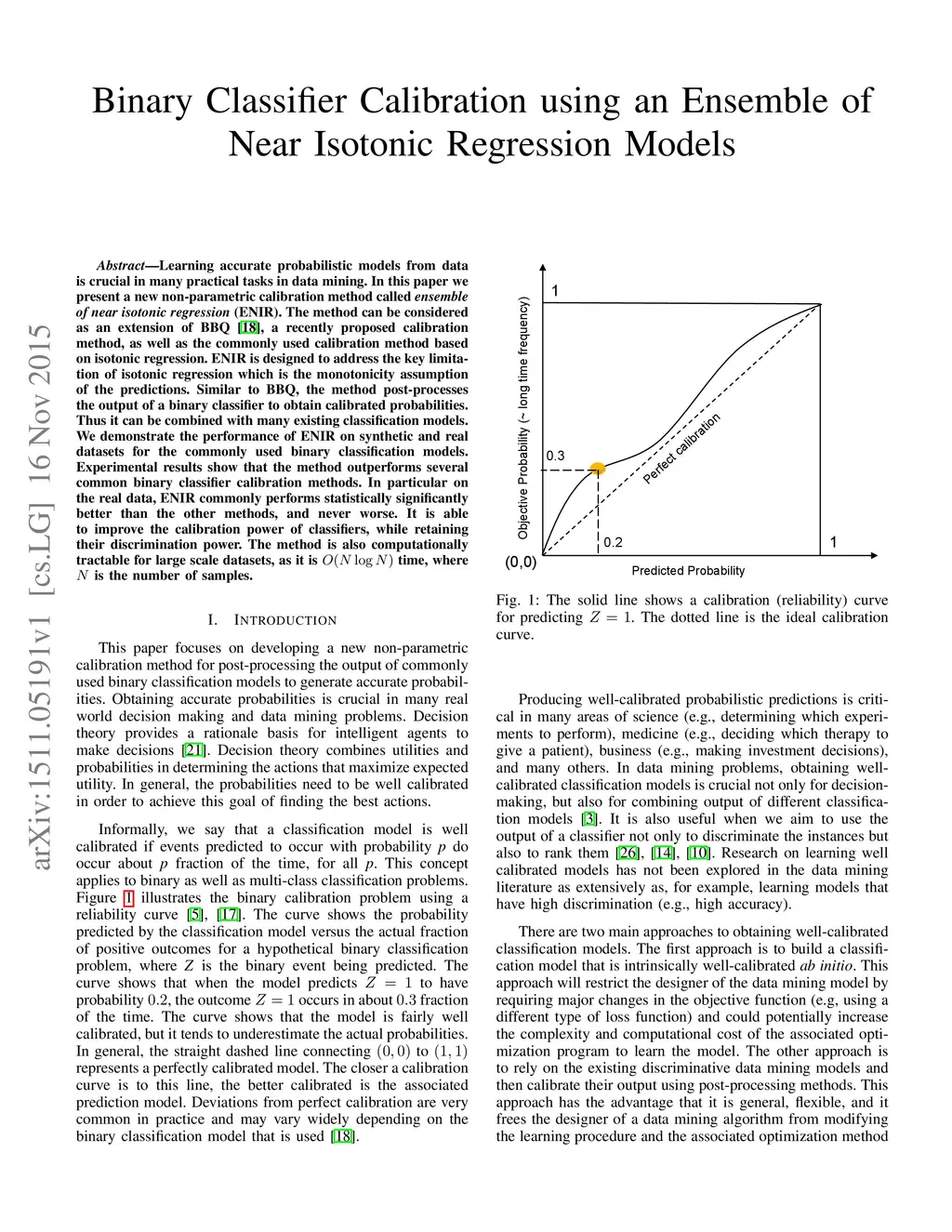 Learning accurate probabilistic models from data is crucial in many practical tasks in data mining. In this paper we present a new non-parametric calibration method called \textit{ensemble of near isotonic regression} (ENIR). The method can be considered as an extension of BBQ, a recently proposed calibration method, as well as the commonly used calibration method based on isotonic regression. ENIR is designed to address the key limitation of isotonic regression which is the monotonicity assumption of the predictions. Similar to BBQ, the method post-processes the output of a binary classifier to obtain calibrated probabilities. Thus it can be combined with many existing classification models. We demonstrate the performance of ENIR on synthetic and real datasets for the commonly used binary classification models. Experimental results show that the method outperforms several common binary classifier calibration methods. In particular on the real data, ENIR commonly performs statistically significantly better than the other methods, and never worse. It is able to improve the calibration power of classifiers, while retaining their discrimination power. The method is also computationally tractable for large scale datasets, as it is time, where is the number of samples.