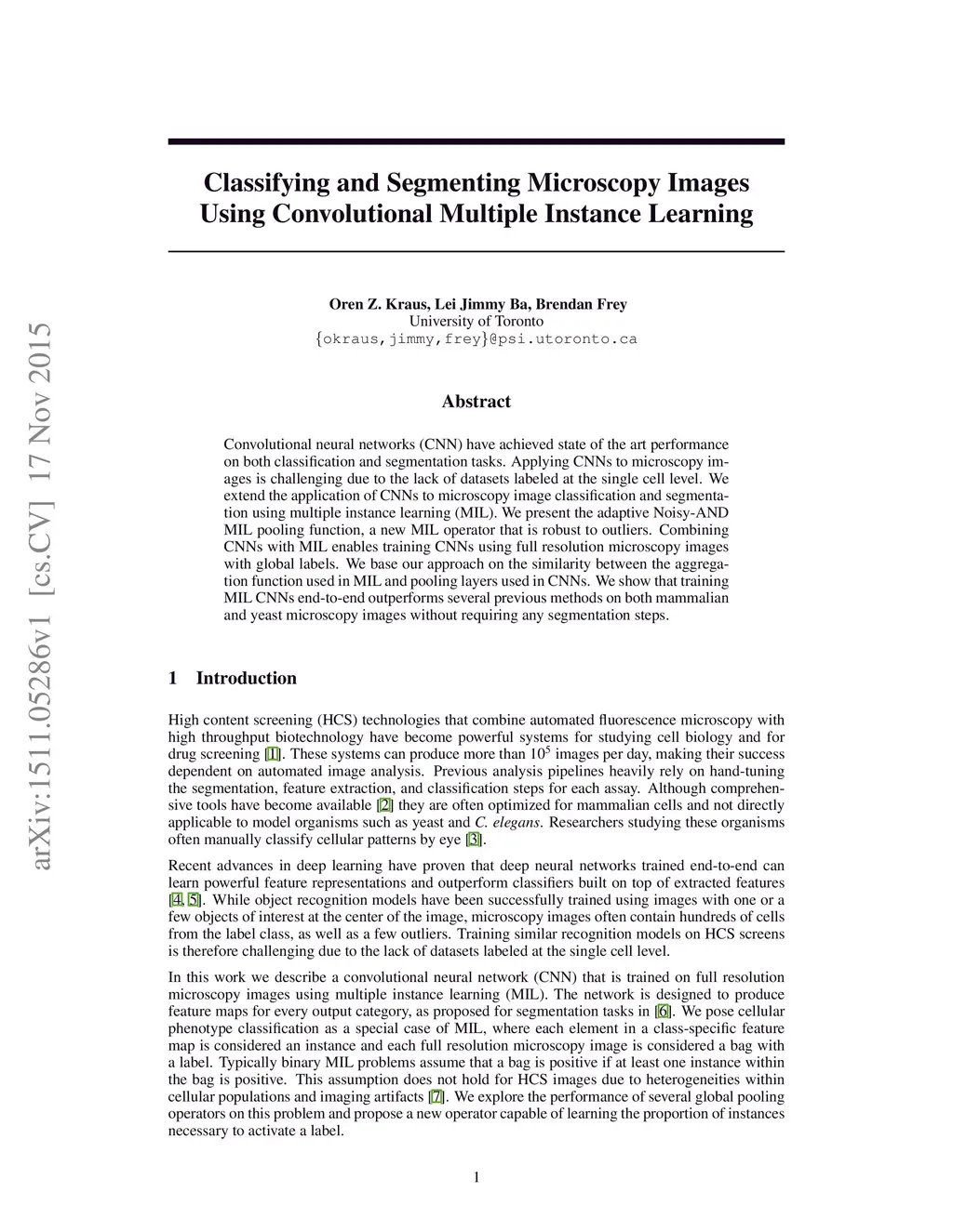 Convolutional neural networks (CNN) have achieved state of the art performance on both classification and segmentation tasks. Applying CNNs to microscopy images is challenging due to the lack of datasets labeled at the single cell level. We extend the application of CNNs to microscopy image classification and segmentation using multiple instance learning (MIL). We present the adaptive Noisy-AND MIL pooling function, a new MIL operator that is robust to outliers. Combining CNNs with MIL enables training CNNs using full resolution microscopy images with global labels. We base our approach on the similarity between the aggregation function used in MIL and pooling layers used in CNNs. We show that training MIL CNNs end-to-end outperforms several previous methods on both mammalian and yeast microscopy images without requiring any segmentation steps.