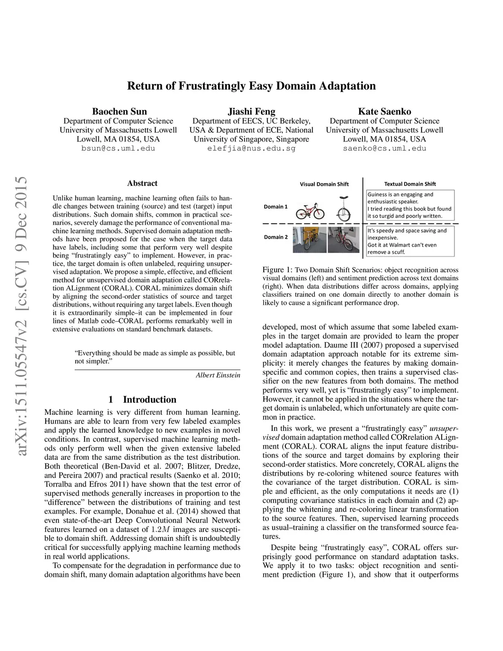 Unlike human learning, machine learning often fails to handle changes between training (source) and test (target) input distributions. Such domain shifts, common in practical scenarios, severely damage the performance of conventional machine learning methods. Supervised domain adaptation methods have been proposed for the case when the target data have labels, including some that perform very well despite being "frustratingly easy" to implement. However, in practice, the target domain is often unlabeled, requiring unsupervised adaptation. We propose a simple, effective, and efficient method for unsupervised domain adaptation called CORrelation ALignment (CORAL). CORAL minimizes domain shift by aligning the second-order statistics of source and target distributions, without requiring any target labels. Even though it is extraordinarily simple--it can be implemented in four lines of Matlab code--CORAL performs remarkably well in extensive evaluations on standard benchmark datasets.