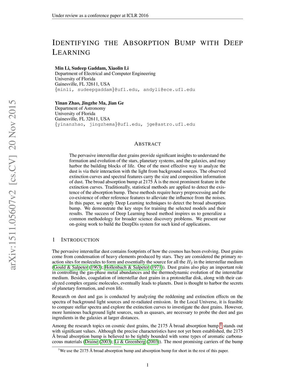 The pervasive interstellar dust grains provide significant insights to understand the formation and evolution of the stars, planetary systems, and the galaxies, and may harbor the building blocks of life. One of the most effective way to analyze the dust is via their interaction with the light from background sources. The observed extinction curves and spectral features carry the size and composition information of dust. The broad absorption bump at 2175 Angstrom is the most prominent feature in the extinction curves. Traditionally, statistical methods are applied to detect the existence of the absorption bump. These methods require heavy preprocessing and the co-existence of other reference features to alleviate the influence from the noises. In this paper, we apply Deep Learning techniques to detect the broad absorption bump. We demonstrate the key steps for training the selected models and their results. The success of Deep Learning based method inspires us to generalize a common methodology for broader science discovery problems. We present our on-going work to build the DeepDis system for such kind of applications.