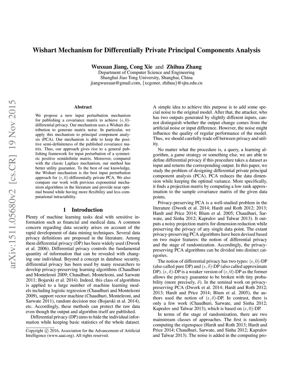 We propose a new input perturbation mechanism for publishing a covariance matrix to achieve -differential privacy. Our mechanism uses a Wishart distribution to generate matrix noise. In particular, We apply this mechanism to principal component analysis. Our mechanism is able to keep the positive semi-definiteness of the published covariance matrix. Thus, our approach gives rise to a general publishing framework for input perturbation of a symmetric positive semidefinite matrix. Moreover, compared with the classic Laplace mechanism, our method has better utility guarantee. To the best of our knowledge, Wishart mechanism is the best input perturbation approach for -differentially private PCA. We also compare our work with previous exponential mechanism algorithms in the literature and provide near optimal bound while having more flexibility and less computational intractability.
