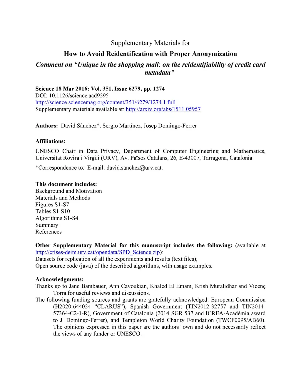 The study by De Montjoye et al. ("Science", 30 January 2015, p. 536) claimed that most individuals can be reidentified from a deidentified credit card transaction database and that anonymization mechanisms are not effective against reidentification. Such claims deserve detailed quantitative scrutiny, as they might seriously undermine the willingness of data owners and subjects to share data for research. In a recent Technical Comment published in "Science" (18 March 2016, p. 1274), we demonstrate that the reidentification risk reported by De Montjoye et al. was significantly overestimated (due to a misunderstanding of the reidentification attack) and that the alleged ineffectiveness of anonymization is due to the choice of poor and undocumented methods and to a general disregard of 40 years of anonymization literature. The technical comment also shows how to properly anonymize data, in order to reduce unequivocal reidentifications to zero while retaining even more analytical utility than with the poor anonymization mechanisms employed by De Montjoye et al. In conclusion, data owners, subjects and users can be reassured that sound privacy models and anonymization methods exist to produce safe and useful anonymized data. Supplementary materials detailing the data sets, algorithms and extended results of our study are available here. Moreover, unlike the De Montjoye et al.'s data set, which was never made available, our data, anonymized results, and anonymization algorithms can be freely downloaded from http://crises-deim.urv.cat/opendata/SPD_Science.zip