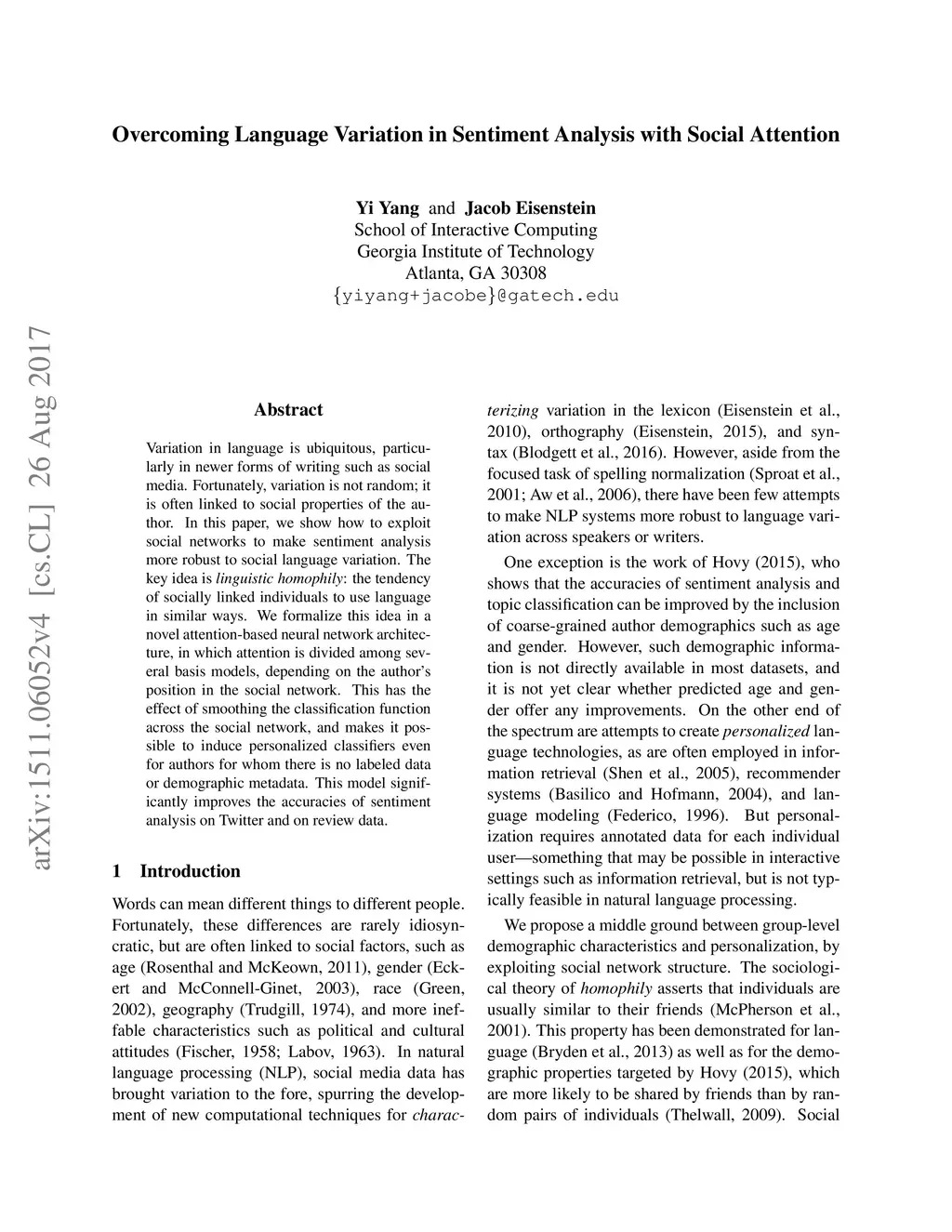 Variation in language is ubiquitous, particularly in newer forms of writing such as social media. Fortunately, variation is not random, it is often linked to social properties of the author. In this paper, we show how to exploit social networks to make sentiment analysis more robust to social language variation. The key idea is linguistic homophily: the tendency of socially linked individuals to use language in similar ways. We formalize this idea in a novel attention-based neural network architecture, in which attention is divided among several basis models, depending on the author's position in the social network. This has the effect of smoothing the classification function across the social network, and makes it possible to induce personalized classifiers even for authors for whom there is no labeled data or demographic metadata. This model significantly improves the accuracies of sentiment analysis on Twitter and on review data.