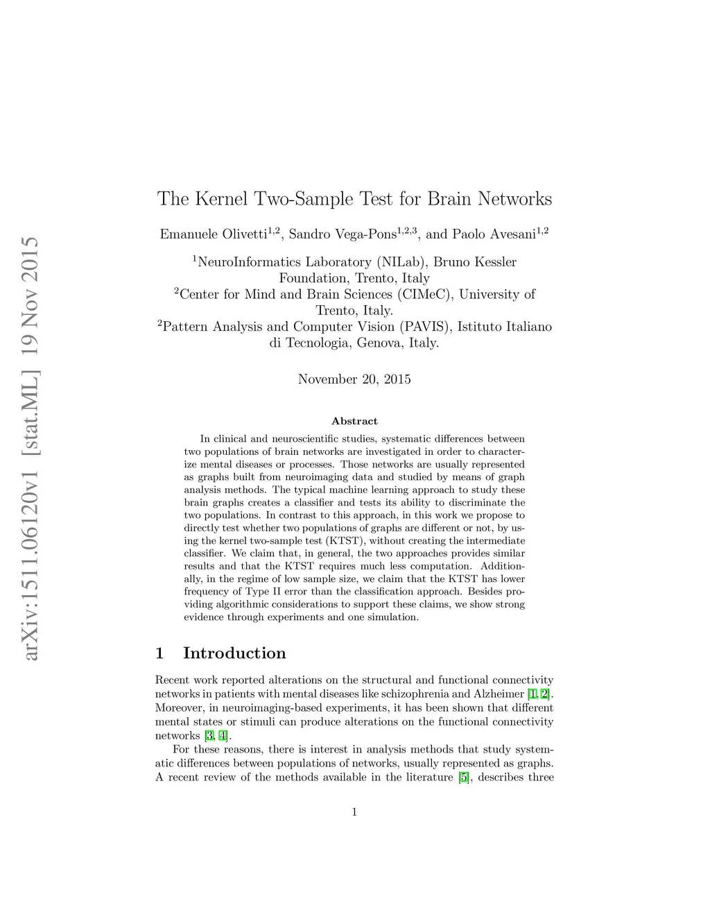 In clinical and neuroscientific studies, systematic differences between two populations of brain networks are investigated in order to characterize mental diseases or processes. Those networks are usually represented as graphs built from neuroimaging data and studied by means of graph analysis methods. The typical machine learning approach to study these brain graphs creates a classifier and tests its ability to discriminate the two populations. In contrast to this approach, in this work we propose to directly test whether two populations of graphs are different or not, by using the kernel two-sample test (KTST), without creating the intermediate classifier. We claim that, in general, the two approaches provides similar results and that the KTST requires much less computation. Additionally, in the regime of low sample size, we claim that the KTST has lower frequency of Type II error than the classification approach. Besides providing algorithmic considerations to support these claims, we show strong evidence through experiments and one simulation.
