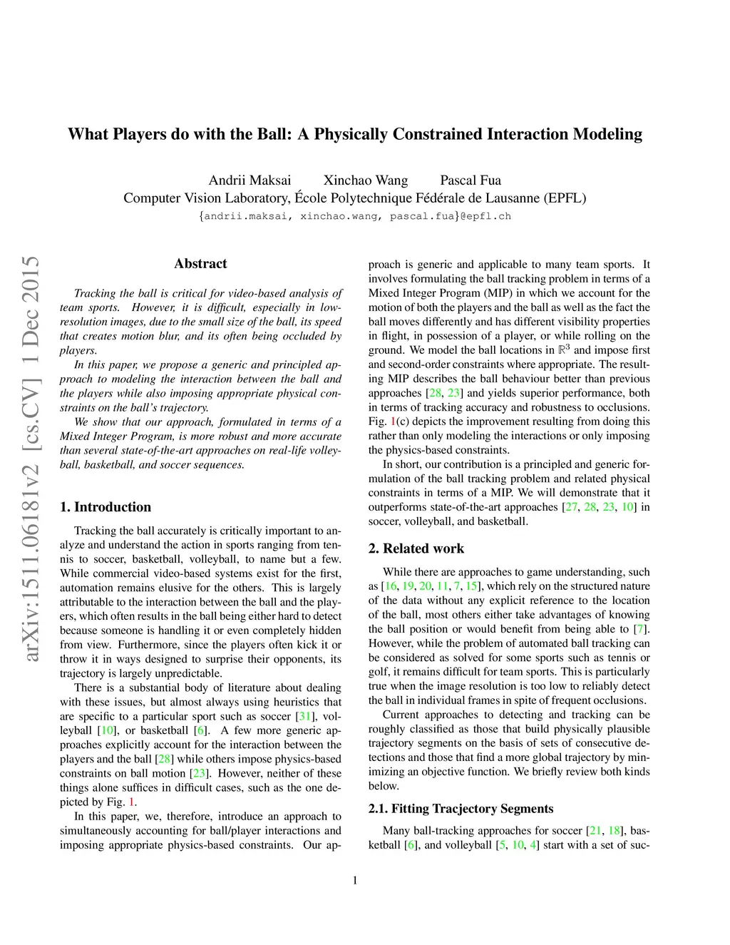 Tracking the ball is critical for video-based analysis of team sports. However, it is difficult, especially in low-resolution images, due to the small size of the ball, its speed that creates motion blur, and its often being occluded by players. In this paper, we propose a generic and principled approach to modeling the interaction between the ball and the players while also imposing appropriate physical constraints on the ball's trajectory. We show that our approach, formulated in terms of a Mixed Integer Program, is more robust and more accurate than several state-of-the-art approaches on real-life volleyball, basketball, and soccer sequences.