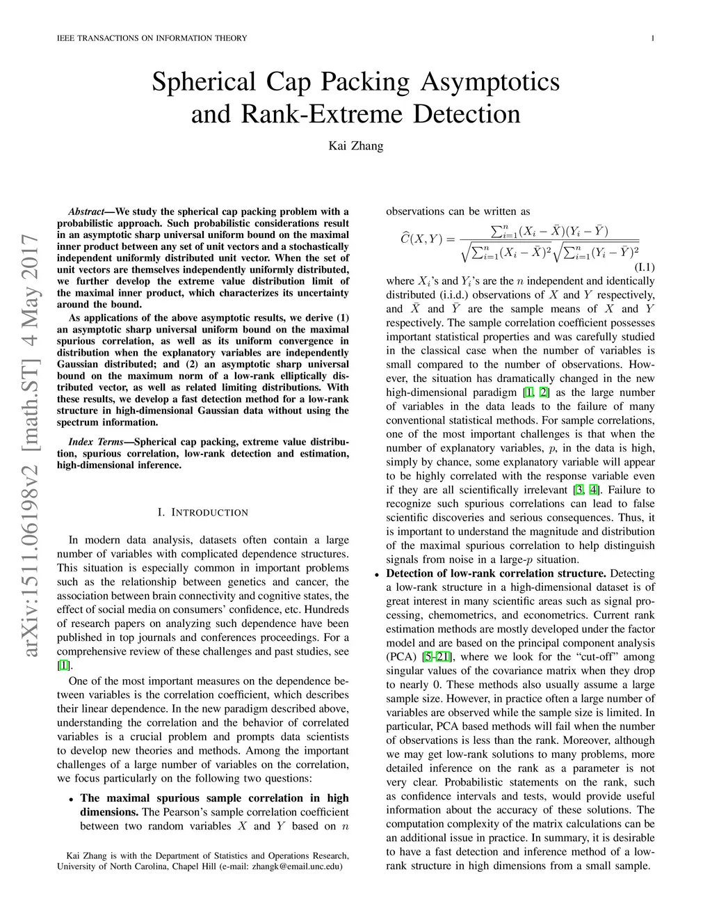 Spherical Cap Packing Asymptotics and Rank-Extreme Detection