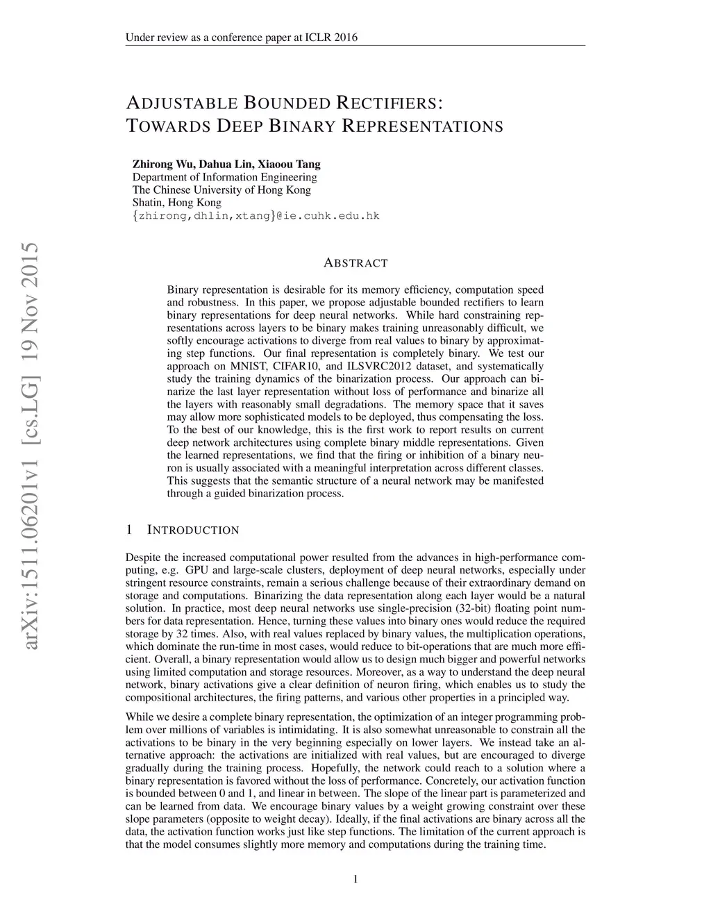 Adjustable Bounded Rectifiers: Towards Deep Binary Representations
