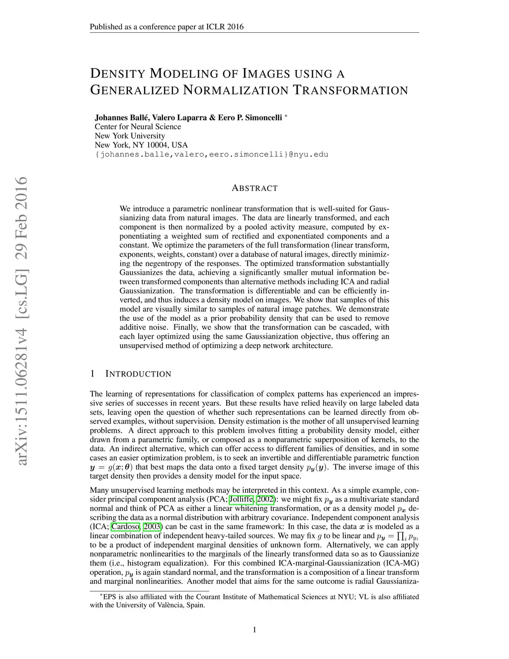 We introduce a parametric nonlinear transformation that is well-suited for Gaussianizing data from natural images. The data are linearly transformed, and each component is then normalized by a pooled activity measure, computed by exponentiating a weighted sum of rectified and exponentiated components and a constant. We optimize the parameters of the full transformation (linear transform, exponents, weights, constant) over a database of natural images, directly minimizing the negentropy of the responses. The optimized transformation substantially Gaussianizes the data, achieving a significantly smaller mutual information between transformed components than alternative methods including ICA and radial Gaussianization. The transformation is differentiable and can be efficiently inverted, and thus induces a density model on images. We show that samples of this model are visually similar to samples of natural image patches. We demonstrate the use of the model as a prior probability density that can be used to remove additive noise. Finally, we show that the transformation can be cascaded, with each layer optimized using the same Gaussianization objective, thus offering an unsupervised method of optimizing a deep network architecture.