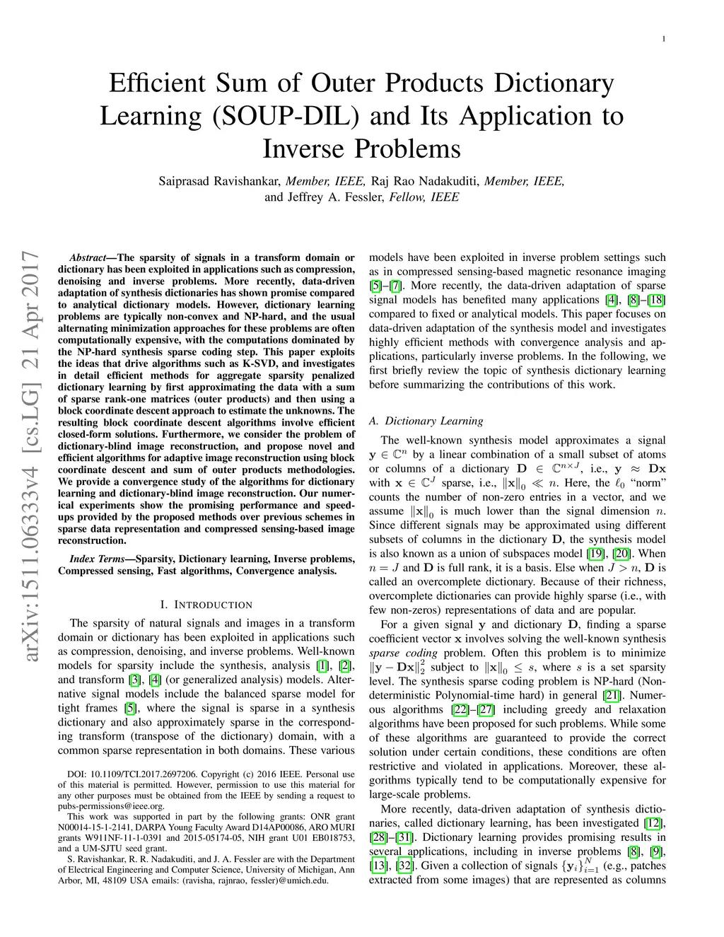 Efficient Sum of Sparse Outer Products Dictionary Learning (SOUP-DIL)