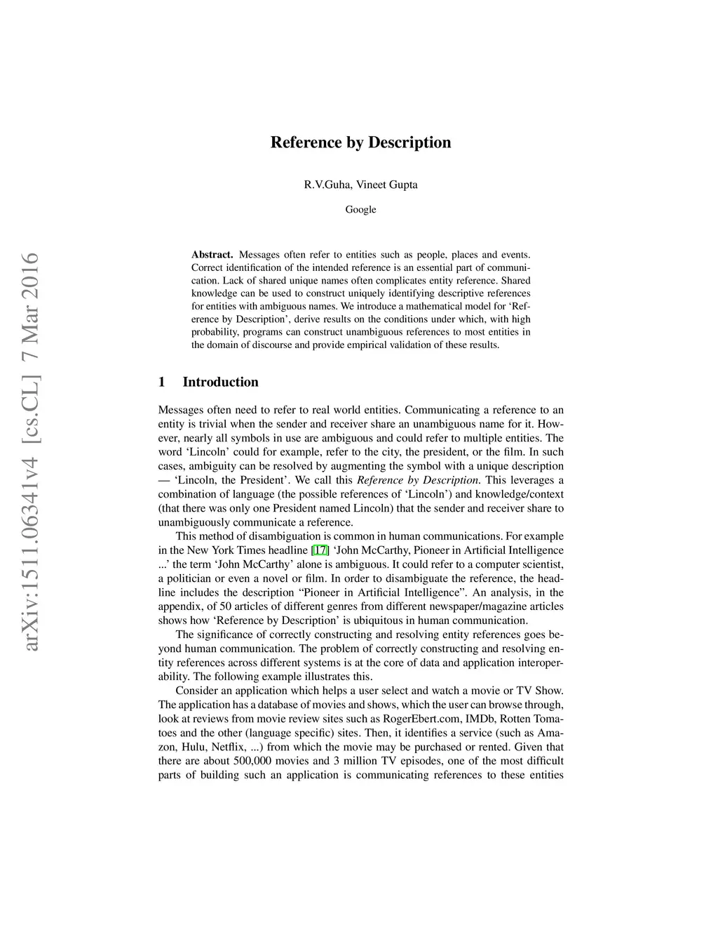 Messages often refer to entities such as people, places and events. Correct identification of the intended reference is an essential part of communication. Lack of shared unique names often complicates entity reference. Shared knowledge can be used to construct uniquely identifying descriptive references for entities with ambiguous names. We introduce a mathematical model for `Reference by Description', derive results on the conditions under which, with high probability, programs can construct unambiguous references to most entities in the domain of discourse and provide empirical validation of these results.