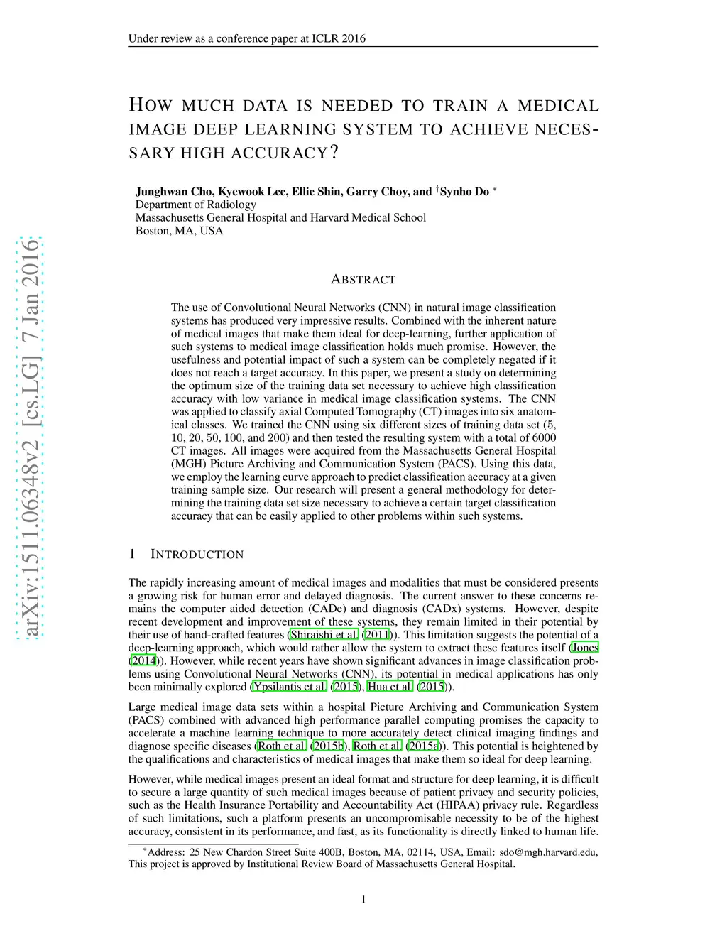 The use of Convolutional Neural Networks (CNN) in natural image classification systems has produced very impressive results. Combined with the inherent nature of medical images that make them ideal for deep-learning, further application of such systems to medical image classification holds much promise. However, the usefulness and potential impact of such a system can be completely negated if it does not reach a target accuracy. In this paper, we present a study on determining the optimum size of the training data set necessary to achieve high classification accuracy with low variance in medical image classification systems. The CNN was applied to classify axial Computed Tomography (CT) images into six anatomical classes. We trained the CNN using six different sizes of training data set (5, 10, 20, 50, 100, and 200) and then tested the resulting system with a total of 6000 CT images. All images were acquired from the Massachusetts General Hospital (MGH) Picture Archiving and Communication System (PACS). Using this data, we employ the learning curve approach to predict classification accuracy at a given training sample size. Our research will present a general methodology for determining the training data set size necessary to achieve a certain target classification accuracy that can be easily applied to other problems within such systems.