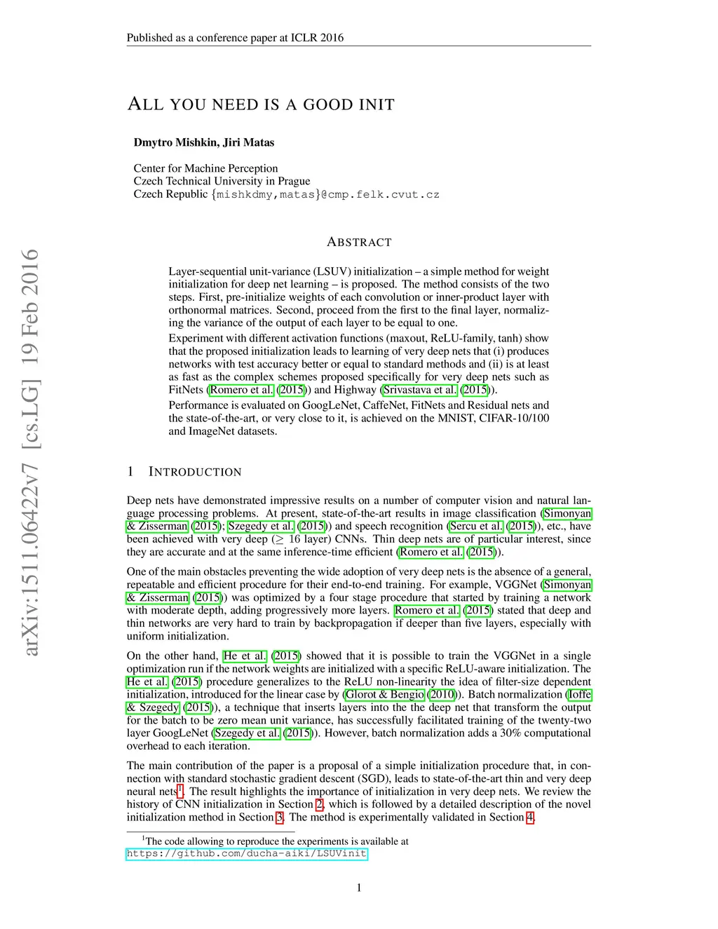 Layer-sequential unit-variance (LSUV) initialization - a simple method for weight initialization for deep net learning - is proposed. The method consists of the two steps. First, pre-initialize weights of each convolution or inner-product layer with orthonormal matrices. Second, proceed from the first to the final layer, normalizing the variance of the output of each layer to be equal to one. Experiment with different activation functions (maxout, ReLU-family, tanh) show that the proposed initialization leads to learning of very deep nets that (i) produces networks with test accuracy better or equal to standard methods and (ii) is at least as fast as the complex schemes proposed specifically for very deep nets such as FitNets (Romero et al. (2015)) and Highway (Srivastava et al. (2015)). Performance is evaluated on GoogLeNet, CaffeNet, FitNets and Residual nets and the state-of-the-art, or very close to it, is achieved on the MNIST, CIFAR-10/100 and ImageNet datasets.