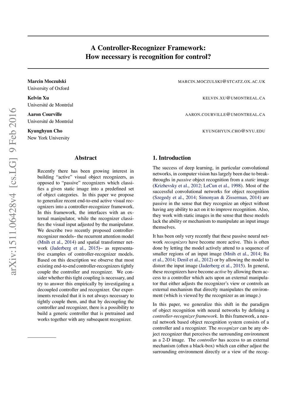 Recently there has been growing interest in building active visual object recognizers, as opposed to the usual passive recognizers which classifies a given static image into a predefined set of object categories. In this paper we propose to generalize these recently proposed end-to-end active visual recognizers into a controller-recognizer framework. A model in the controller-recognizer framework consists of a controller, which interfaces with an external manipulator, and a recognizer which classifies the visual input adjusted by the manipulator. We describe two most recently proposed controller-recognizer models: recurrent attention model and spatial transformer network as representative examples of controller-recognizer models. Based on this description we observe that most existing end-to-end controller-recognizers tightly, or completely, couple a controller and recognizer. We ask a question whether this tight coupling is necessary, and try to answer this empirically by building a controller-recognizer model with a decoupled controller and recognizer. Our experiments revealed that it is not always necessary to tightly couple them and that by decoupling a controller and recognizer, there is a possibility of building a generic controller that is pretrained and works together with any subsequent recognizer.