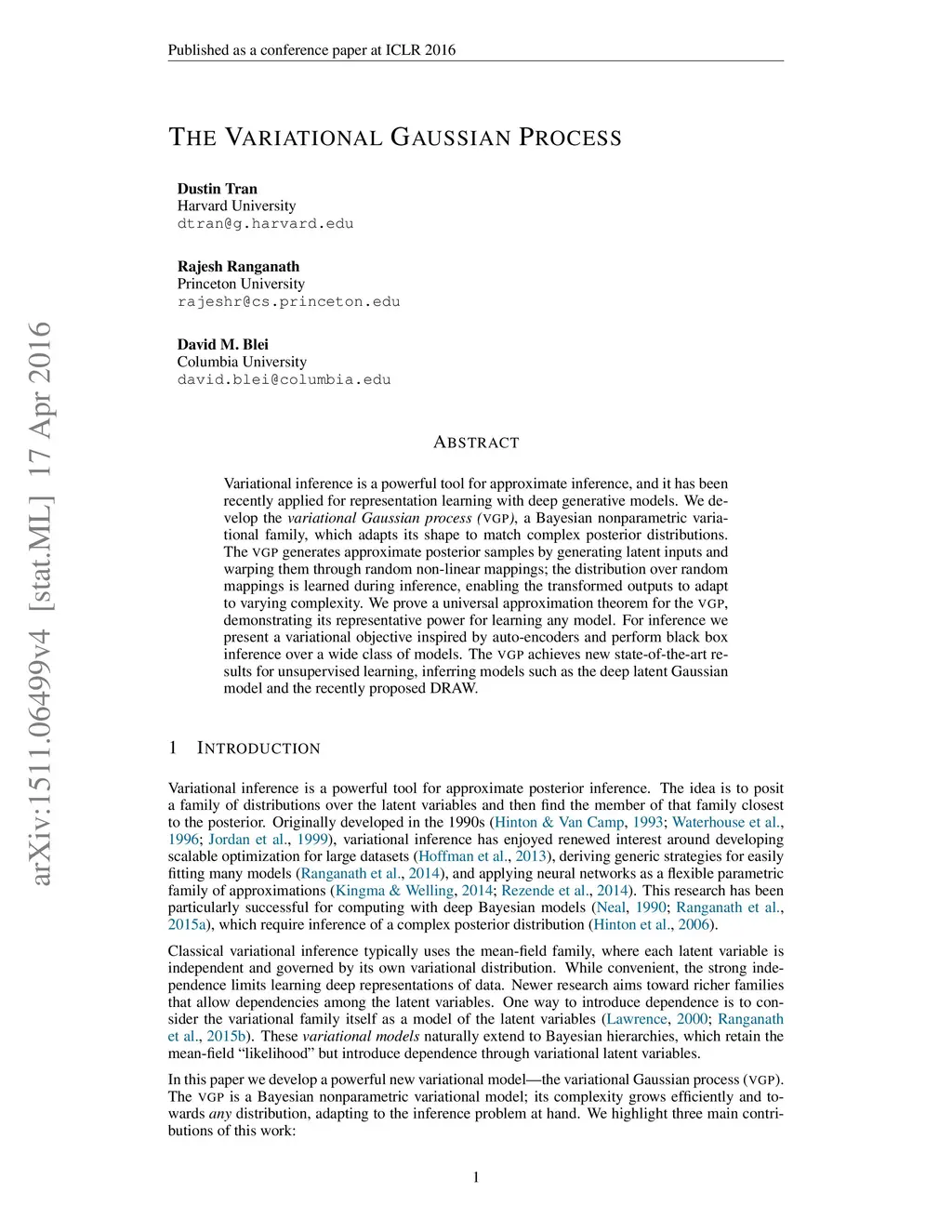 Variational inference is a powerful tool for approximate inference, and it has been recently applied for representation learning with deep generative models. We develop the variational Gaussian process (VGP), a Bayesian nonparametric variational family, which adapts its shape to match complex posterior distributions. The VGP generates approximate posterior samples by generating latent inputs and warping them through random non-linear mappings; the distribution over random mappings is learned during inference, enabling the transformed outputs to adapt to varying complexity. We prove a universal approximation theorem for the VGP, demonstrating its representative power for learning any model. For inference we present a variational objective inspired by auto-encoders and perform black box inference over a wide class of models. The VGP achieves new state-of-the-art results for unsupervised learning, inferring models such as the deep latent Gaussian model and the recently proposed DRAW.