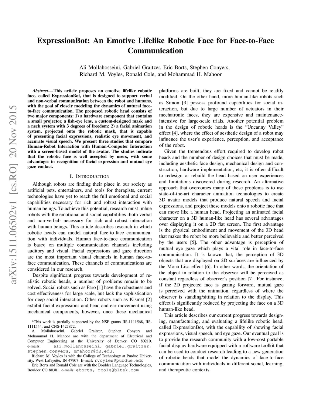 ExpressionBot: An Emotive Lifelike Robotic Face for Face-to-Face