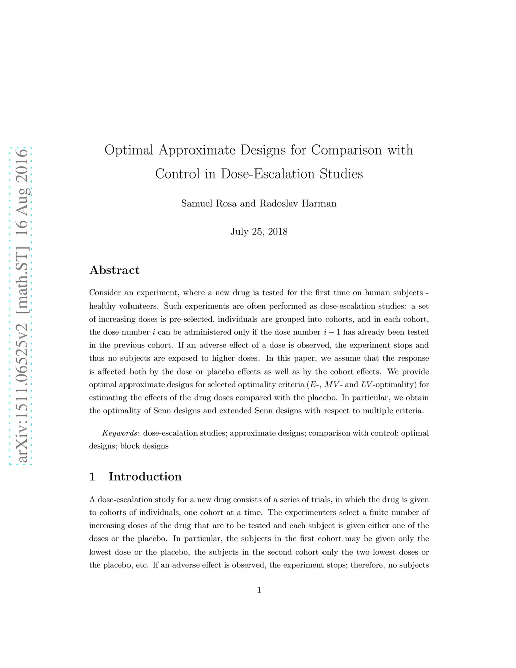 Consider an experiment, where a new drug is tested for the first time on human subjects - healthy volunteers. Such experiments are often performed as dose-escalation studies: a set of increasing doses is pre-selected, individuals are grouped into cohorts, and in each cohort, the dose number can be administered only if the dose number has already been tested in the previous cohort. If an adverse effect of a dose is observed, the experiment stops and thus no subjects are exposed to higher doses. In this paper, we assume that the response is affected both by the dose or placebo effects as well as by the cohort effects. We provide optimal approximate designs for selected optimality criteria (-, - and -optimality) for estimating the effects of the drug doses compared with the placebo. In particular, we obtain the optimality of Senn designs and extended Senn designs with respect to multiple criteria.