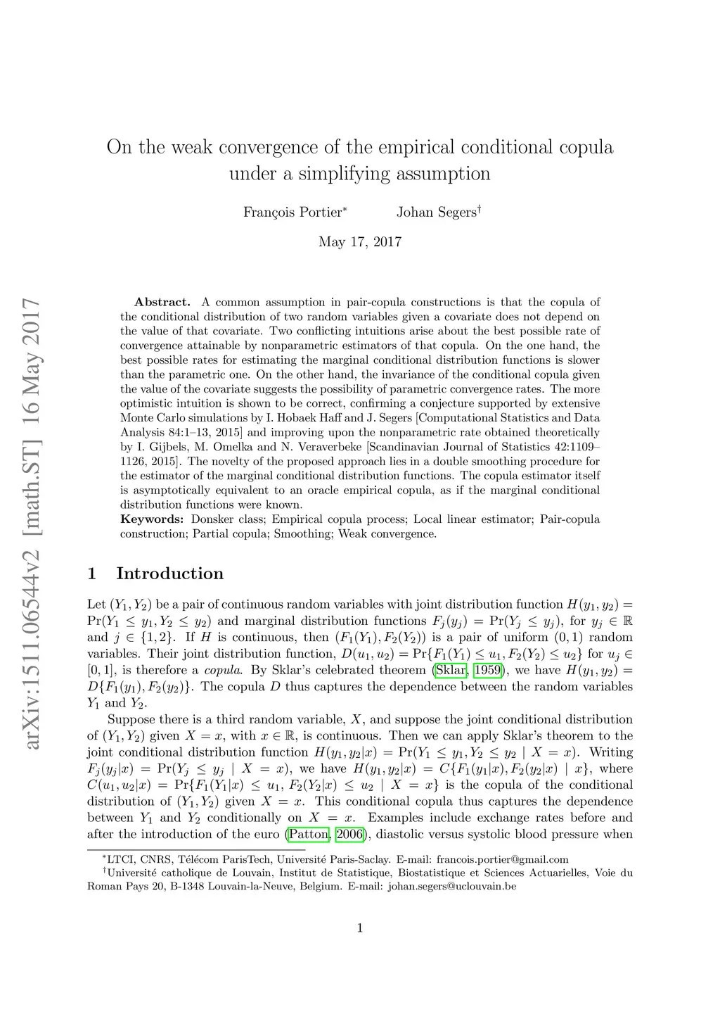 When the copula of the conditional distribution of two random variables given a covariate does not depend on the value of the covariate, two conflicting intuitions arise about the best possible rate of convergence attainable by nonparametric estimators of that copula. In the end, any such estimator must be based on the marginal conditional distribution functions of the two dependent variables given the covariate, and the best possible rates for estimating such localized objects is slower than the parametric one. However, the invariance of the conditional copula given the value of the covariate suggests the possibility of parametric convergence rates. The more optimistic intuition is shown to be correct, confirming a conjecture supported by extensive Monte Carlo simulations by I. Hobaek Haff and J. Segers [Computational Statistics and Data Analysis 84:1--13, 2015] and improving upon the nonparametric rate obtained theoretically by I. Gijbels, M. Omelka and N. Veraverbeke [Scandinavian Journal of Statistics 2015, to appear]. The novelty of the proposed approach lies in the double smoothing procedure employed for the estimator of the marginal cumulative distribution functions. Under mild conditions on the bandwidth sequence, the estimator is shown to take values in a certain class of smooth functions, the class having sufficiently small entropy for empirical process arguments to work. The copula estimator itself is asymptotically undistinguishable from a kind of oracle empirical copula, making it appear as if the marginal conditional distribution functions were known.