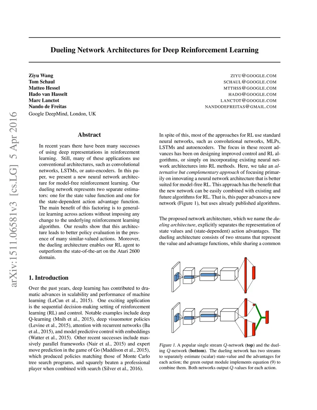 Dueling Network Architectures for Deep Reinforcement Learning