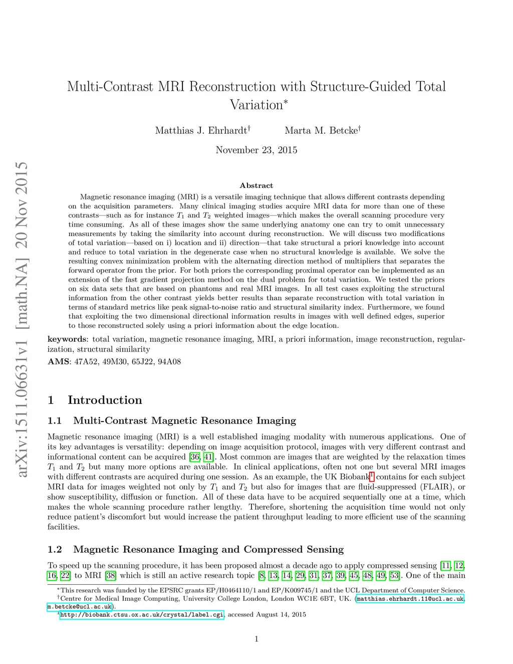 Magnetic resonance imaging (MRI) is a versatile imaging technique that allows different contrasts depending on the acquisition parameters. Many clinical imaging studies acquire MRI data for more than one of these contrasts---such as for instance T1 and T2 weighted images---which makes the overall scanning procedure very time consuming. As all of these images show the same underlying anatomy one can try to omit unnecessary measurements by taking the similarity into account during reconstruction. We will discuss two modifications of total variation---based on i) location and ii) direction---that take structural a priori knowledge into account and reduce to total variation in the degenerate case when no structural knowledge is available. We solve the resulting convex minimization problem with the alternating direction method of multipliers that separates the forward operator from the prior. For both priors the corresponding proximal operator can be implemented as an extension of the fast gradient projection method on the dual problem for total variation. We tested the priors on six data sets that are based on phantoms and real MRI images. In all test cases exploiting the structural information from the other contrast yields better results than separate reconstruction with total variation in terms of standard metrics like peak signal-to-noise ratio and structural similarity index. Furthermore, we found that exploiting the two dimensional directional information results in images with well defined edges, superior to those reconstructed solely using a priori information about the edge location.