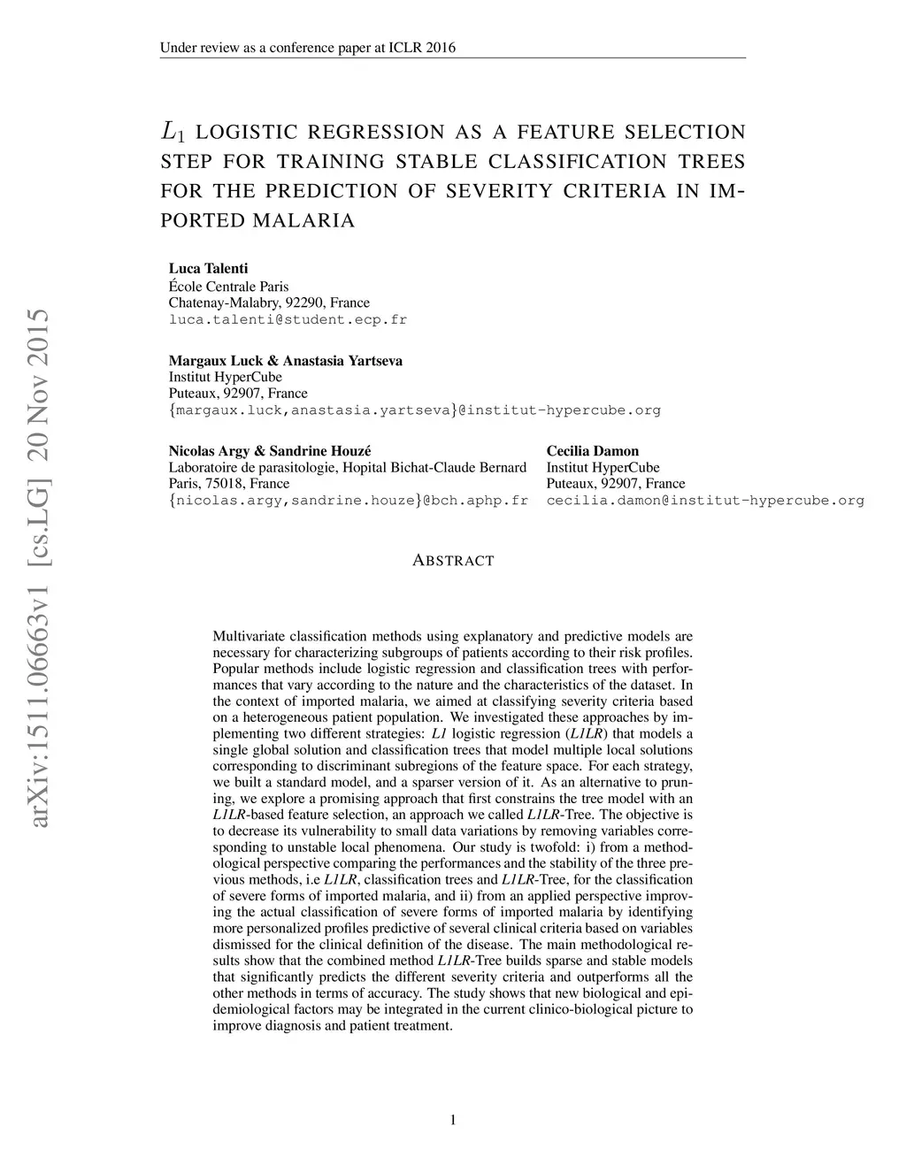 Multivariate classification methods using explanatory and predictive models are necessary for characterizing subgroups of patients according to their risk profiles. Popular methods include logistic regression and classification trees with performances that vary according to the nature and the characteristics of the dataset. In the context of imported malaria, we aimed at classifying severity criteria based on a heterogeneous patient population. We investigated these approaches by implementing two different strategies: L1 logistic regression (L1LR) that models a single global solution and classification trees that model multiple local solutions corresponding to discriminant subregions of the feature space. For each strategy, we built a standard model, and a sparser version of it. As an alternative to pruning, we explore a promising approach that first constrains the tree model with an L1LR-based feature selection, an approach we called L1LR-Tree. The objective is to decrease its vulnerability to small data variations by removing variables corresponding to unstable local phenomena. Our study is twofold: i) from a methodological perspective comparing the performances and the stability of the three previous methods, i.e L1LR, classification trees and L1LR-Tree, for the classification of severe forms of imported malaria, and ii) from an applied perspective improving the actual classification of severe forms of imported malaria by identifying more personalized profiles predictive of several clinical criteria based on variables dismissed for the clinical definition of the disease. The main methodological results show that the combined method L1LR-Tree builds sparse and stable models that significantly predicts the different severity criteria and outperforms all the other methods in terms of accuracy.