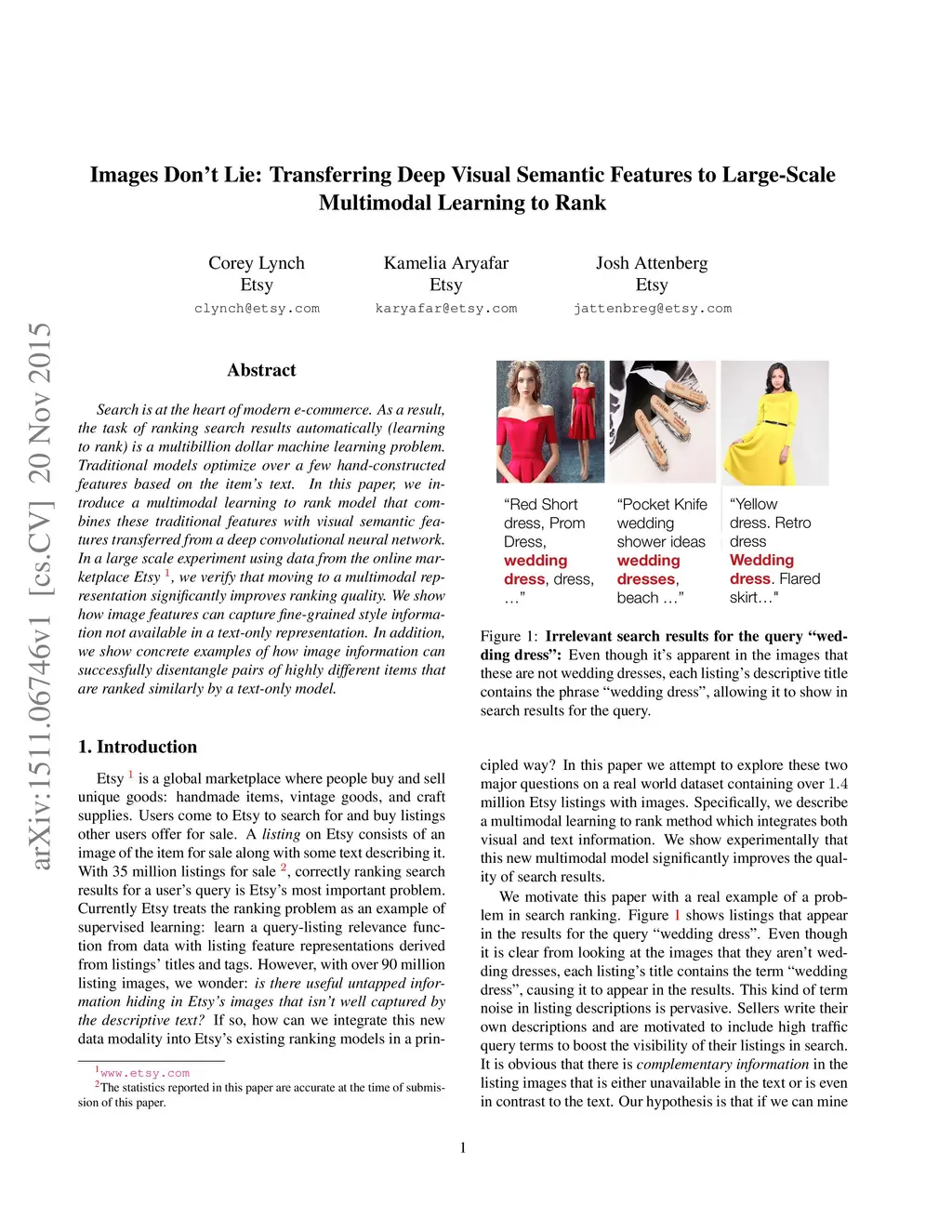Search is at the heart of modern e-commerce. As a result, the task of ranking search results automatically (learning to rank) is a multibillion dollar machine learning problem. Traditional models optimize over a few hand-constructed features based on the item's text. In this paper, we introduce a multimodal learning to rank model that combines these traditional features with visual semantic features transferred from a deep convolutional neural network. In a large scale experiment using data from the online marketplace Etsy, we verify that moving to a multimodal representation significantly improves ranking quality. We show how image features can capture fine-grained style information not available in a text-only representation. In addition, we show concrete examples of how image information can successfully disentangle pairs of highly different items that are ranked similarly by a text-only model.