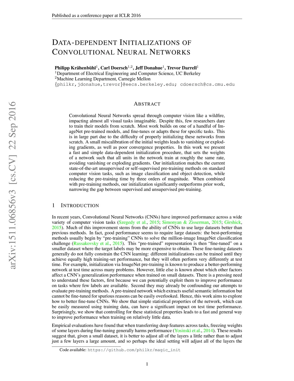 Convolutional Neural Networks spread through computer vision like a wildfire, impacting almost all visual tasks imaginable. Despite this, few researchers dare to train their models from scratch. Most work builds on one of a handful of ImageNet pre-trained models, and fine-tunes or adapts these for specific tasks. This is in large part due to the difficulty of properly initializing these networks from scratch. A small miscalibration of the initial weights leads to vanishing or exploding gradients, as well as poor convergence properties. In this work we present a fast and simple data-dependent initialization procedure, that sets the weights of a network such that all units in the network train at roughly the same rate, avoiding vanishing or exploding gradients. Our initialization matches the current state-of-the-art unsupervised or self-supervised pre-training methods on standard computer vision tasks, such as image classification and object detection, while being roughly three orders of magnitude faster. When combined with pre-training methods, our initialization significantly outperforms prior work, narrowing the gap between supervised and unsupervised pre-training.