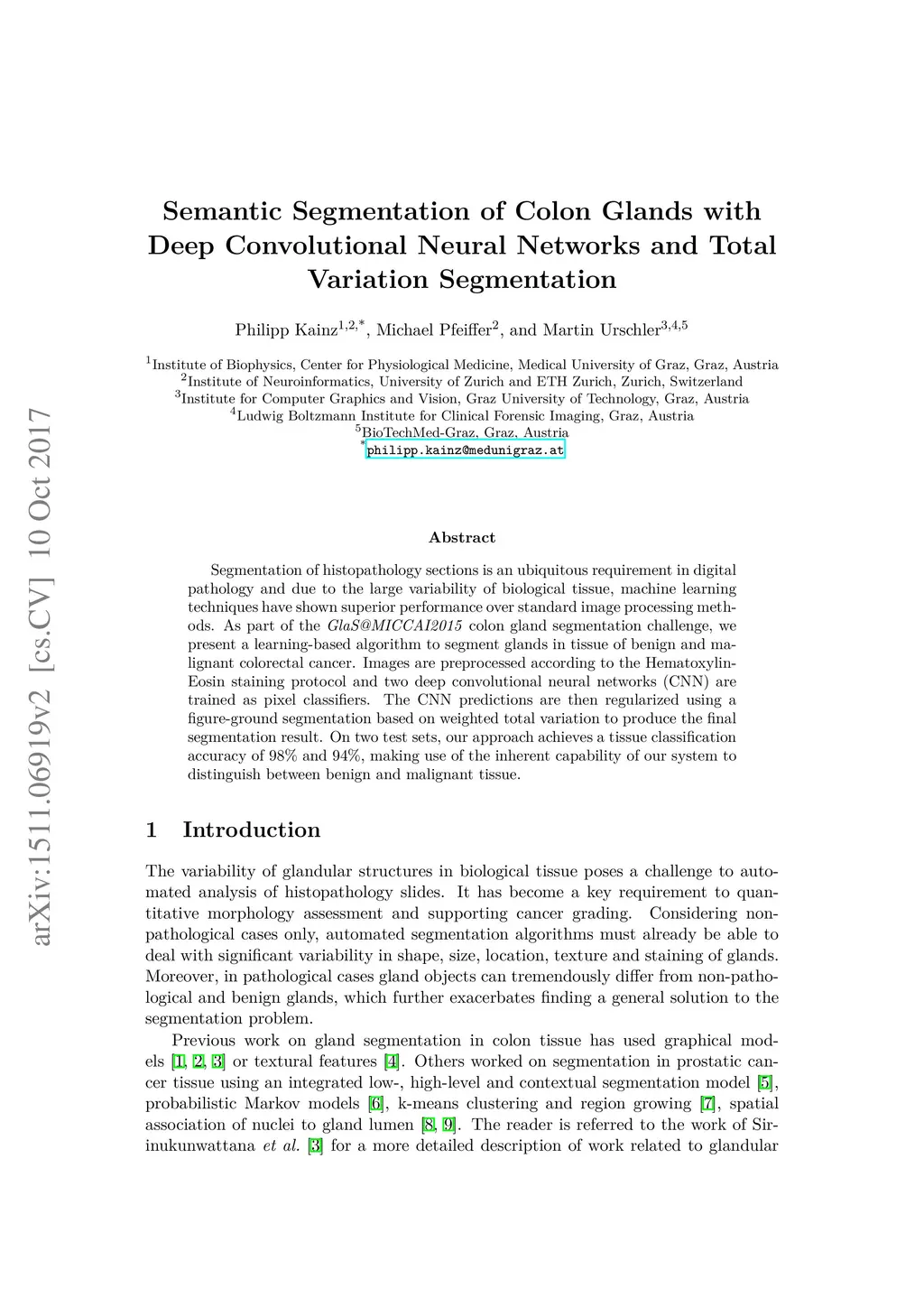 Segmentation of histopathology sections is an ubiquitous requirement in digital pathology and due to the large variability of biological tissue, machine learning techniques have shown superior performance over standard image processing methods. As part of the GlaS@MICCAI2015 colon gland segmentation challenge, we present a learning-based algorithm to segment glands in tissue of benign and malignant colorectal cancer. Images are preprocessed according to the Hematoxylin-Eosin staining protocol and two deep convolutional neural networks (CNN) are trained as pixel classifiers. The CNN predictions are then regularized using a figure-ground segmentation based on weighted total variation to produce the final segmentation result. On two test sets, our approach achieves a tissue classification accuracy of 98% and 94%, making use of the inherent capability of our system to distinguish between benign and malignant tissue.