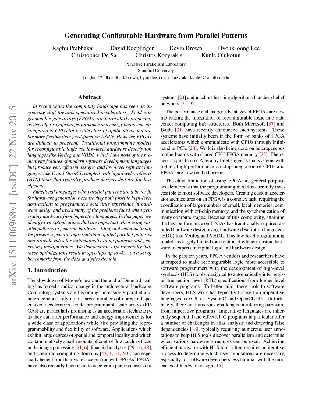 In recent years the computing landscape has seen an in- creasing shift towards specialized accelerators. Field pro- grammable gate arrays (FPGAs) are particularly promising as they offer significant performance and energy improvements compared to CPUs for a wide class of applications and are far more flexible than fixed-function ASICs. However, FPGAs are difficult to program. Traditional programming models for reconfigurable logic use low-level hardware description languages like Verilog and VHDL, which have none of the pro- ductivity features of modern software development languages but produce very efficient designs, and low-level software lan- guages like C and OpenCL coupled with high-level synthesis (HLS) tools that typically produce designs that are far less efficient. Functional languages with parallel patterns are a better fit for hardware generation because they both provide high-level abstractions to programmers with little experience in hard- ware design and avoid many of the problems faced when gen- erating hardware from imperative languages. In this paper, we identify two optimizations that are important when using par- allel patterns to generate hardware: tiling and metapipelining. We present a general representation of tiled parallel patterns, and provide rules for automatically tiling patterns and gen- erating metapipelines. We demonstrate experimentally that these optimizations result in speedups up to 40x on a set of benchmarks from the data analytics domain.