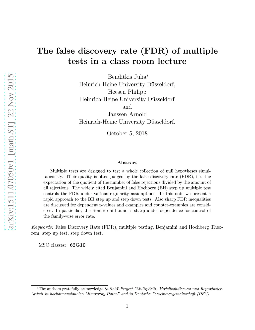 The False Discovery Rate (FDR) of Multiple Tests in a Class Room Lecture