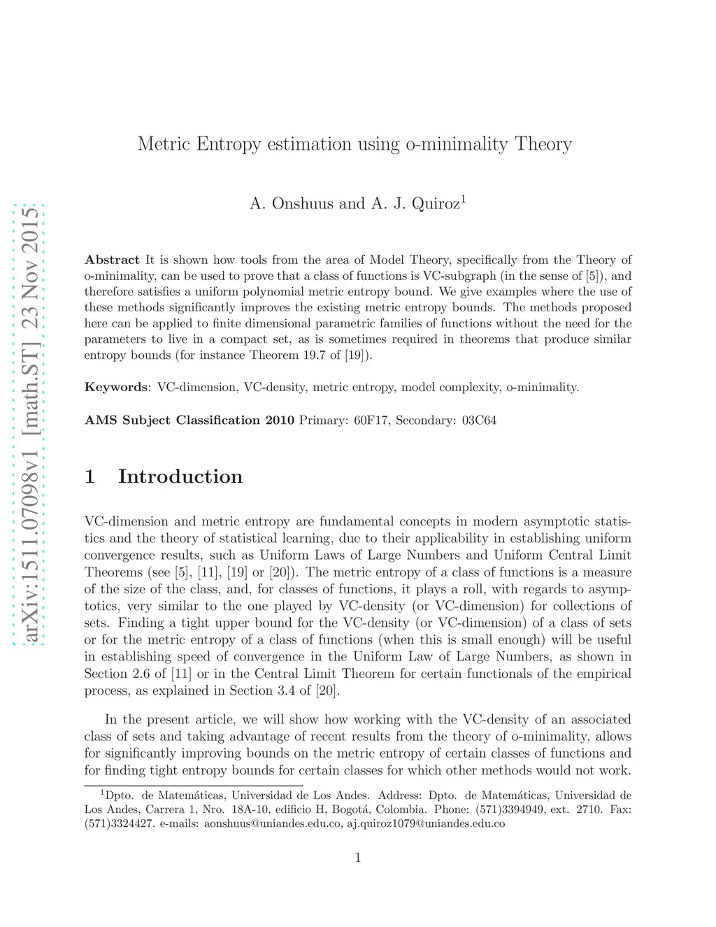It is shown how tools from the area of Model Theory, specifically from the Theory of o-minimality, can be used to prove that a class of functions is VC-subgraph (in the sense of Dudley, 1987), and therefore satisfies a uniform polynomial metric entropy bound. We give examples where the use of these methods significantly improves the existing metric entropy bounds. The methods proposed here can be applied to finite dimensional parametric families of functions without the need for the parameters to live in a compact set, as is sometimes required in theorems that produce similar entropy bounds (for instance Theorem 19.7 of van der Vaart, 1998).
