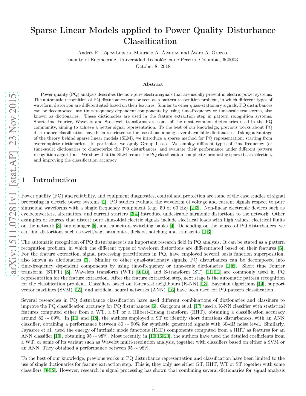Sparse Linear Models applied to Power Quality Disturbance Classification