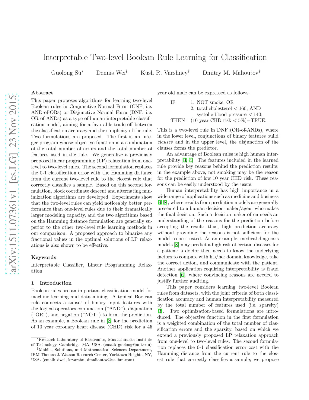 This paper proposes algorithms for learning two-level Boolean rules in Conjunctive Normal Form (CNF, i.e. AND-of-ORs) or Disjunctive Normal Form (DNF, i.e. OR-of-ANDs) as a type of human-interpretable classification model, aiming for a favorable trade-off between the classification accuracy and the simplicity of the rule. Two formulations are proposed. The first is an integer program whose objective function is a combination of the total number of errors and the total number of features used in the rule. We generalize a previously proposed linear programming (LP) relaxation from one-level to two-level rules. The second formulation replaces the 0-1 classification error with the Hamming distance from the current two-level rule to the closest rule that correctly classifies a sample. Based on this second formulation, block coordinate descent and alternating minimization algorithms are developed. Experiments show that the two-level rules can yield noticeably better performance than one-level rules due to their dramatically larger modeling capacity, and the two algorithms based on the Hamming distance formulation are generally superior to the other two-level rule learning methods in our comparison. A proposed approach to binarize any fractional values in the optimal solutions of LP relaxations is also shown to be effective.