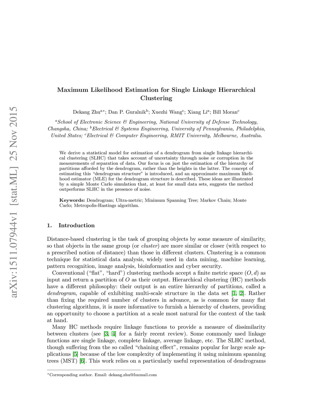 We derive a statistical model for estimation of a dendrogram from single linkage hierarchical clustering (SLHC) that takes account of uncertainty through noise or corruption in the measurements of separation of data. Our focus is on just the estimation of the hierarchy of partitions afforded by the dendrogram, rather than the heights in the latter. The concept of estimating this "dendrogram structure'' is introduced, and an approximate maximum likelihood estimator (MLE) for the dendrogram structure is described. These ideas are illustrated by a simple Monte Carlo simulation that, at least for small data sets, suggests the method outperforms SLHC in the presence of noise.
