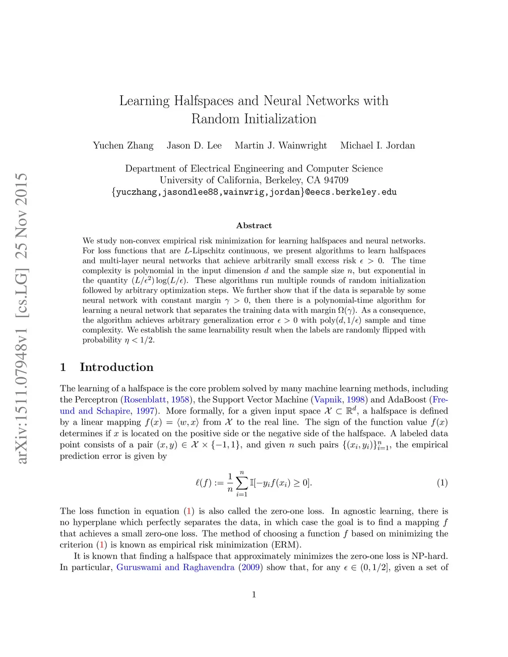 We study non-convex empirical risk minimization for learning halfspaces and neural networks. For loss functions that are -Lipschitz continuous, we present algorithms to learn halfspaces and multi-layer neural networks that achieve arbitrarily small excess risk . The time complexity is polynomial in the input dimension and the sample size , but exponential in the quantity . These algorithms run multiple rounds of random initialization followed by arbitrary optimization steps. We further show that if the data is separable by some neural network with constant margin , then there is a polynomial-time algorithm for learning a neural network that separates the training data with margin . As a consequence, the algorithm achieves arbitrary generalization error with sample and time complexity. We establish the same learnability result when the labels are randomly flipped with probability .