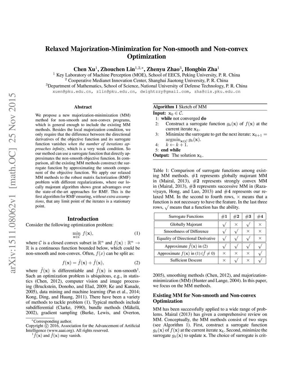 We propose a new majorization-minimization (MM) method for non-smooth and non-convex programs, which is general enough to include the existing MM methods. Besides the local majorization condition, we only require that the difference between the directional derivatives of the objective function and its surrogate function vanishes when the number of iterations approaches infinity, which is a very weak condition. So our method can use a surrogate function that directly approximates the non-smooth objective function. In comparison, all the existing MM methods construct the surrogate function by approximating the smooth component of the objective function. We apply our relaxed MM methods to the robust matrix factorization (RMF) problem with different regularizations, where our locally majorant algorithm shows advantages over the state-of-the-art approaches for RMF. This is the first algorithm for RMF ensuring, without extra assumptions, that any limit point of the iterates is a stationary point.