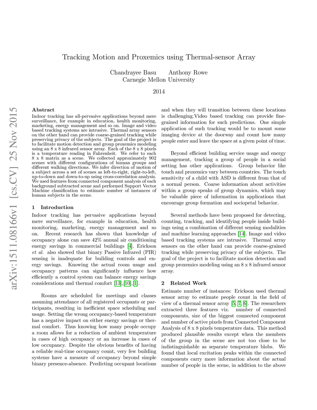 Indoor tracking has all-pervasive applications beyond mere surveillance, for example in education, health monitoring, marketing, energy management and so on. Image and video based tracking systems are intrusive. Thermal array sensors on the other hand can provide coarse-grained tracking while preserving privacy of the subjects. The goal of the project is to facilitate motion detection and group proxemics modeling using an 8 x 8 infrared sensor array. Each of the 8 x 8 pixels is a temperature reading in Fahrenheit. We refer to each 8 x 8 matrix as a scene. We collected approximately 902 scenes with different configurations of human groups and different walking directions. We infer direction of motion of a subject across a set of scenes as left-to-right, right-to-left, up-to-down and down-to-up using cross-correlation analysis. We used features from connected component analysis of each background subtracted scene and performed Support Vector Machine classification to estimate number of instances of human subjects in the scene.
