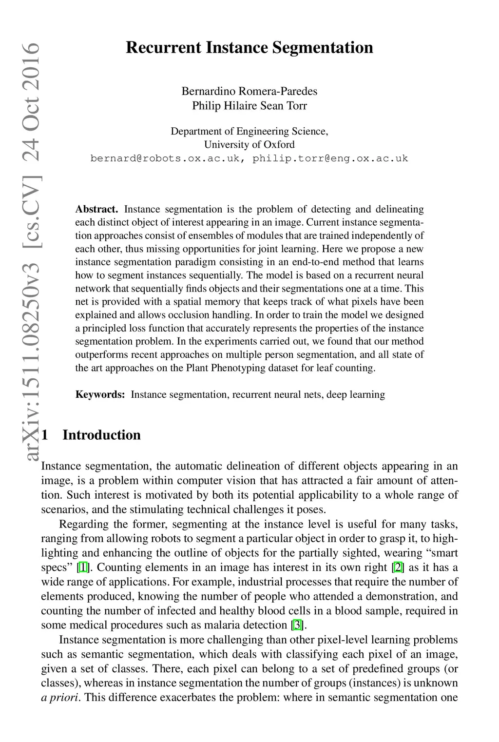 Instance segmentation is the problem of detecting and delineating each object of interest appearing in an image. Current instance segmentation approaches consist of ensembles of modules that are trained independently of each other, thus missing learning opportunities. Here we propose a new instance segmentation paradigm consisting in an end-to-end method that learns how to segment instances sequentially. The model is based on a recurrent neural network that sequentially finds objects and their segmentations one at a time. This net is provided with a spatial memory that keeps track of what pixels have been explained and allows handling occlusion. In order to train the model we designed a new principled loss function that accurately represents the properties of the instance segmentation problem. In the experiments carried out we found that our method outperforms all state of the art approaches on the Plant Phenotyping dataset.