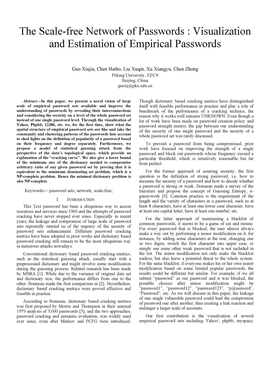 In this paper, we present a novel vision of large scale of empirical password sets available and improve the understanding of passwords by revealing their interconnections and considering the security on a level of the whole password set instead of one single password level. Through the visualization of Yahoo, Phpbb, 12306, etc. we, for the first time, show what the spatial structure of empirical password sets are like and take the community and clustering patterns of the passwords into account to shed lights on the definition of popularity of a password based on their frequency and degree separately. Furthermore, we propose a model of statistical guessing attack from the perspective of the data's topological space, which provide an explanation of the "cracking curve". We also give a lower bound of the minimum size of the dictionary needed to compromise arbitrary ratio of any given password set by proving that it is equivalent to the minimum dominating set problem, which is a NP-complete problem. Hence the minimal dictionary problem is also NP-complete.