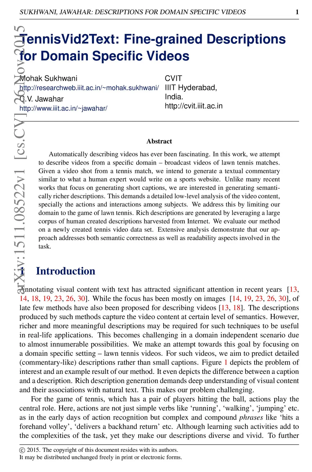 TennisVid2Text: Fine-grained Descriptions for Domain Specific Videos