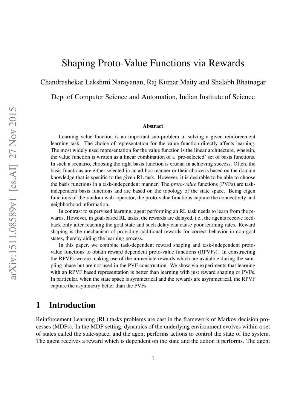 In this paper, we combine task-dependent reward shaping and task-independent proto-value functions to obtain reward dependent proto-value functions (RPVFs). In constructing the RPVFs we are making use of the immediate rewards which are available during the sampling phase but are not used in the PVF construction. We show via experiments that learning with an RPVF based representation is better than learning with just reward shaping or PVFs. In particular, when the state space is symmetrical and the rewards are asymmetrical, the RPVF capture the asymmetry better than the PVFs.
