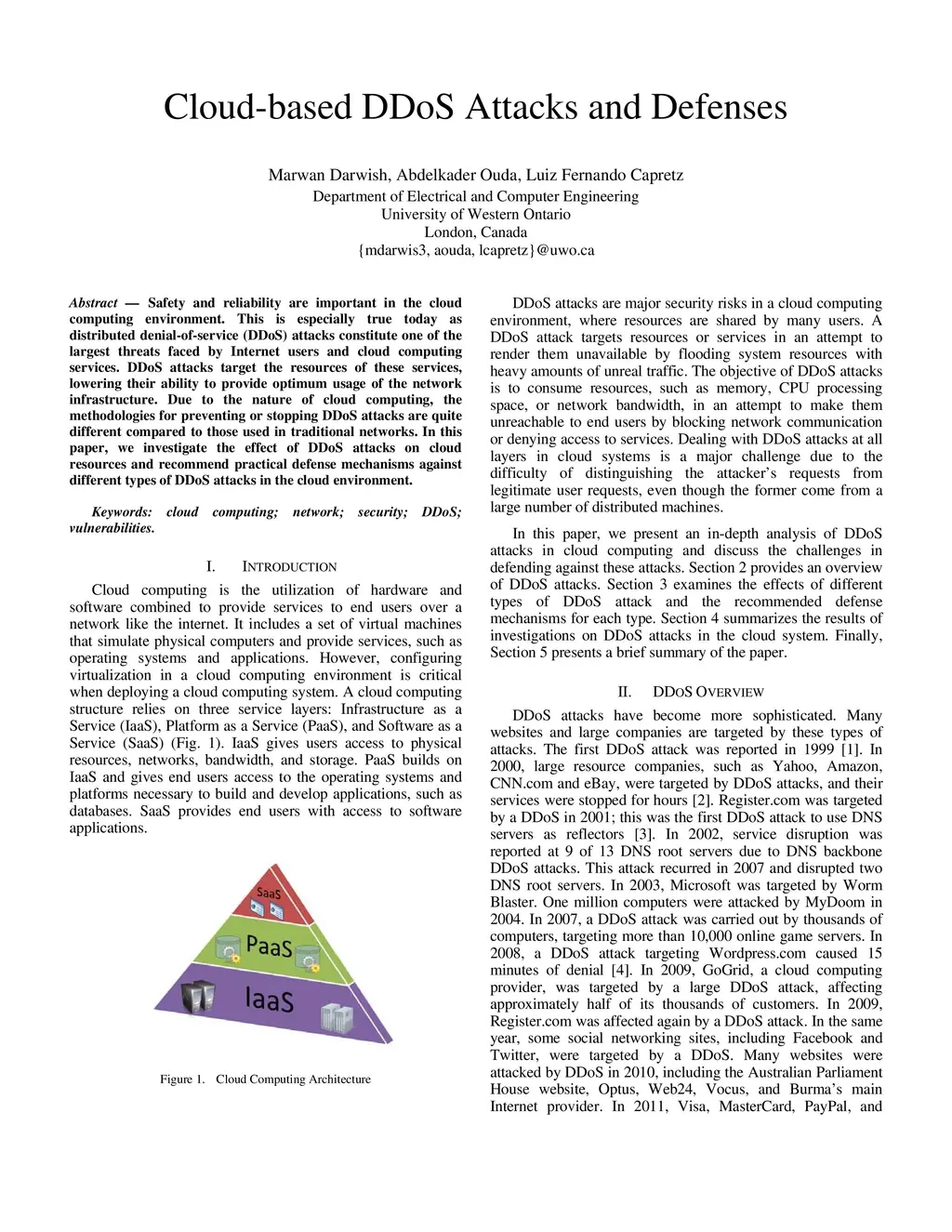Safety and reliability are important in the cloud computing environment. This is especially true today as distributed denial-of-service (DDoS) attacks constitute one of the largest threats faced by Internet users and cloud computing services. DDoS attacks target the resources of these services, lowering their ability to provide optimum usage of the network infrastructure. Due to the nature of cloud computing, the methodologies for preventing or stopping DDoS attacks are quite different compared to those used in traditional networks. In this paper, we investigate the effect of DDoS attacks on cloud resources and recommend practical defense mechanisms against different types of DDoS attacks in the cloud environment.
