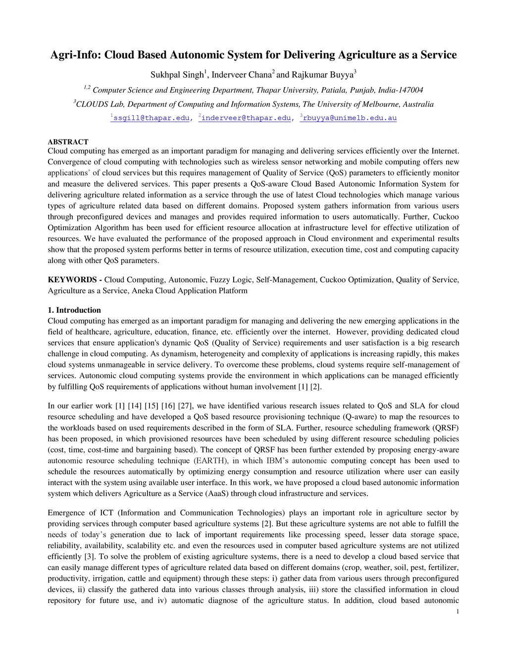 Agri-Info: Cloud Based Autonomic System for Delivering Agriculture as a