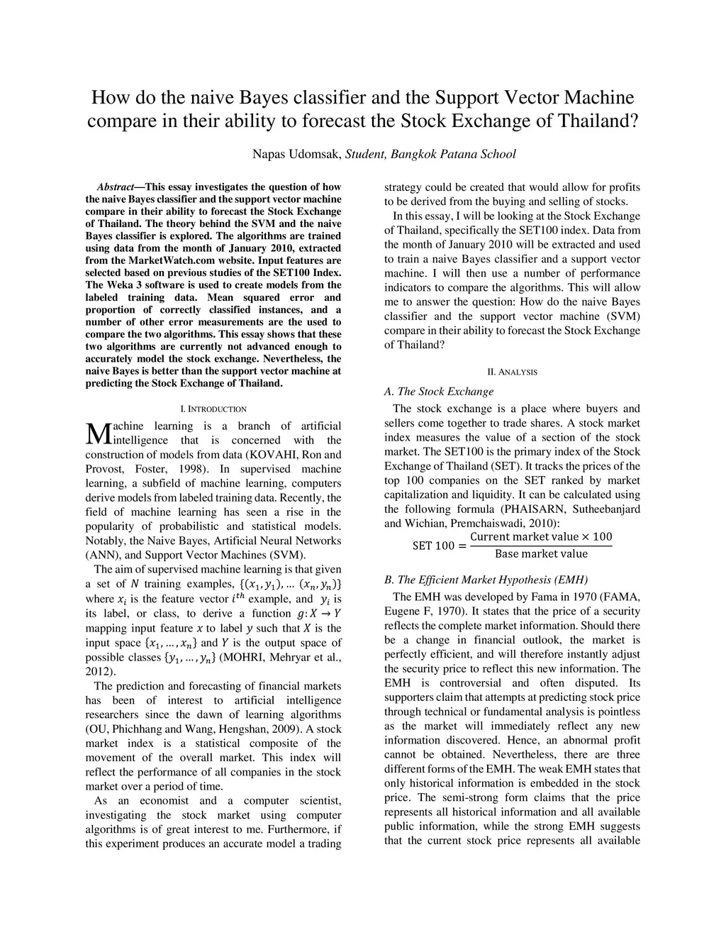 This essay investigates the question of how the naive Bayes classifier and the support vector machine compare in their ability to forecast the Stock Exchange of Thailand. The theory behind the SVM and the naive Bayes classifier is explored. The algorithms are trained using data from the month of January 2010, extracted from the MarketWatch.com website. Input features are selected based on previous studies of the SET100 Index. The Weka 3 software is used to create models from the labeled training data. Mean squared error and proportion of correctly classified instances, and a number of other error measurements are the used to compare the two algorithms. This essay shows that these two algorithms are currently not advanced enough to accurately model the stock exchange. Nevertheless, the naive Bayes is better than the support vector machine at predicting the Stock Exchange of Thailand.