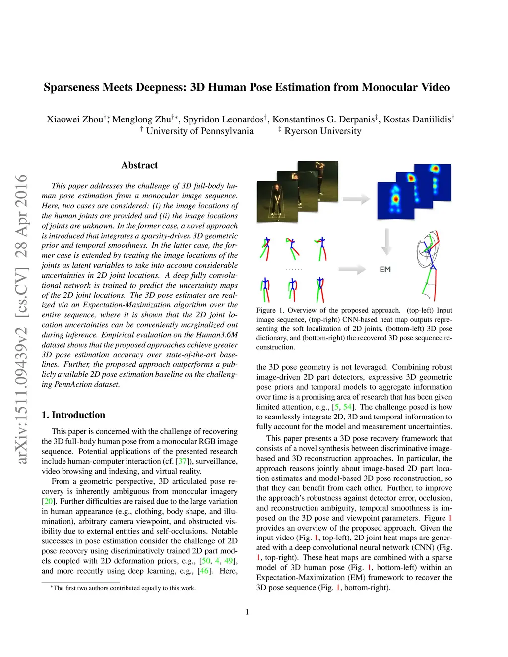 This paper addresses the challenge of 3D full-body human pose estimation from a monocular image sequence. Here, two cases are considered: (i) the image locations of the human joints are provided and (ii) the image locations of joints are unknown. In the former case, a novel approach is introduced that integrates a sparsity-driven 3D geometric prior and temporal smoothness. In the latter case, the former case is extended by treating the image locations of the joints as latent variables. A deep fully convolutional network is trained to predict the uncertainty maps of the 2D joint locations. The 3D pose estimates are realized via an Expectation-Maximization algorithm over the entire sequence, where it is shown that the 2D joint location uncertainties can be conveniently marginalized out during inference. Empirical evaluation on the Human3.6M dataset shows that the proposed approaches achieve greater 3D pose estimation accuracy over state-of-the-art baselines. Further, the proposed approach outperforms a publicly available 2D pose estimation baseline on the challenging PennAction dataset.