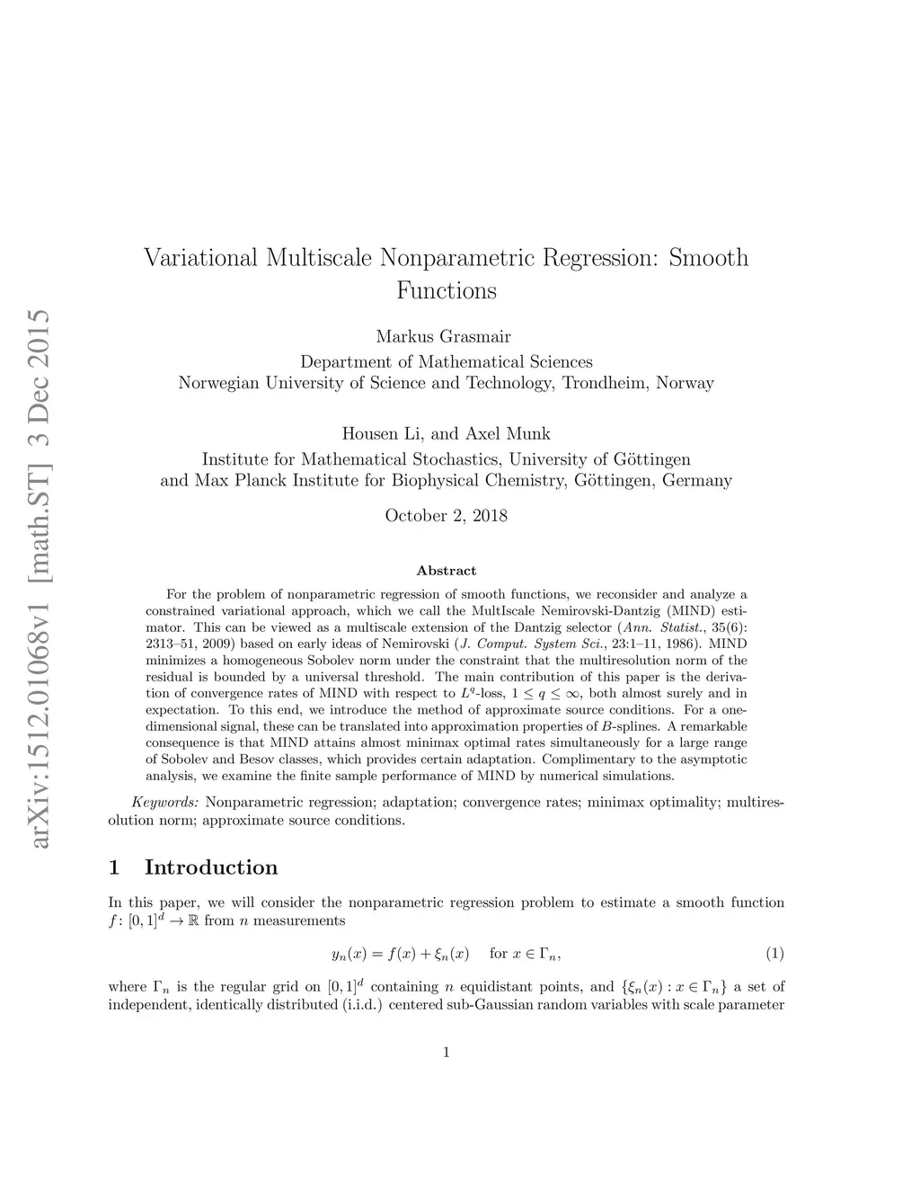For the problem of nonparametric regression of smooth functions, we reconsider and analyze a constrained variational approach, which we call the MultIscale Nemirovski-Dantzig (MIND) estimator. This can be viewed as a multiscale extension of the Dantzig selector (\emph{Ann. Statist.}, 35(6): 2313--51, 2009) based on early ideas of Nemirovski (\emph{J. Comput. System Sci.}, 23:1--11, 1986). MIND minimizes a homogeneous Sobolev norm under the constraint that the multiresolution norm of the residual is bounded by a universal threshold. The main contribution of this paper is the derivation of convergence rates of MIND with respect to -loss, , both almost surely and in expectation. To this end, we introduce the method of approximate source conditions. For a one-dimensional signal, these can be translated into approximation properties of -splines. A remarkable consequence is that MIND attains almost minimax optimal rates simultaneously for a large range of Sobolev and Besov classes, which provides certain adaptation. Complimentary to the asymptotic analysis, we examine the finite sample performance of MIND by numerical simulations.