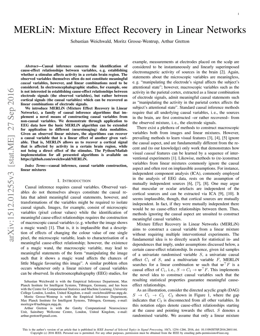 Causal inference concerns the identification of cause-effect relationships between variables, e.g. establishing whether a stimulus affects activity in a certain brain region. The observed variables themselves often do not constitute meaningful causal variables, however, and linear combinations need to be considered. In electroencephalographic studies, for example, one is not interested in establishing cause-effect relationships between electrode signals (the observed variables), but rather between cortical signals (the causal variables) which can be recovered as linear combinations of electrode signals. We introduce MERLiN (Mixture Effect Recovery in Linear Networks), a family of causal inference algorithms that implement a novel means of constructing causal variables from non-causal variables. We demonstrate through application to EEG data how the basic MERLiN algorithm can be extended for application to different (neuroimaging) data modalities. Given an observed linear mixture, the algorithms can recover a causal variable that is a linear effect of another given variable. That is, MERLiN allows us to recover a cortical signal that is affected by activity in a certain brain region, while not being a direct effect of the stimulus. The Python/Matlab implementation for all presented algorithms is available on https://github.com/sweichwald/MERLiN