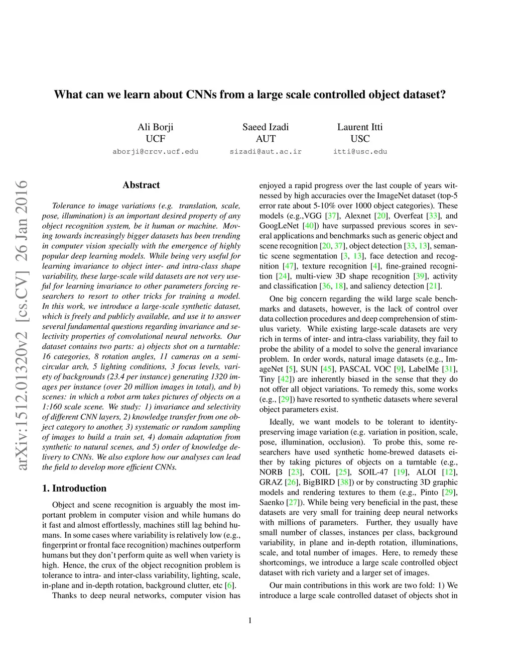 Tolerance to image variations (e.g. translation, scale, pose, illumination) is an important desired property of any object recognition system, be it human or machine. Moving towards increasingly bigger datasets has been trending in computer vision specially with the emergence of highly popular deep learning models. While being very useful for learning invariance to object inter- and intra-class shape variability, these large-scale wild datasets are not very useful for learning invariance to other parameters forcing researchers to resort to other tricks for training a model. In this work, we introduce a large-scale synthetic dataset, which is freely and publicly available, and use it to answer several fundamental questions regarding invariance and selectivity properties of convolutional neural networks. Our dataset contains two parts: a) objects shot on a turntable: 16 categories, 8 rotation angles, 11 cameras on a semicircular arch, 5 lighting conditions, 3 focus levels, variety of backgrounds (23.4 per instance) generating 1320 images per instance (over 20 million images in total), and b) scenes: in which a robot arm takes pictures of objects on a 1:160 scale scene. We study: 1) invariance and selectivity of different CNN layers, 2) knowledge transfer from one object category to another, 3) systematic or random sampling of images to build a train set, 4) domain adaptation from synthetic to natural scenes, and 5) order of knowledge delivery to CNNs. We also explore how our analyses can lead the field to develop more efficient CNNs.